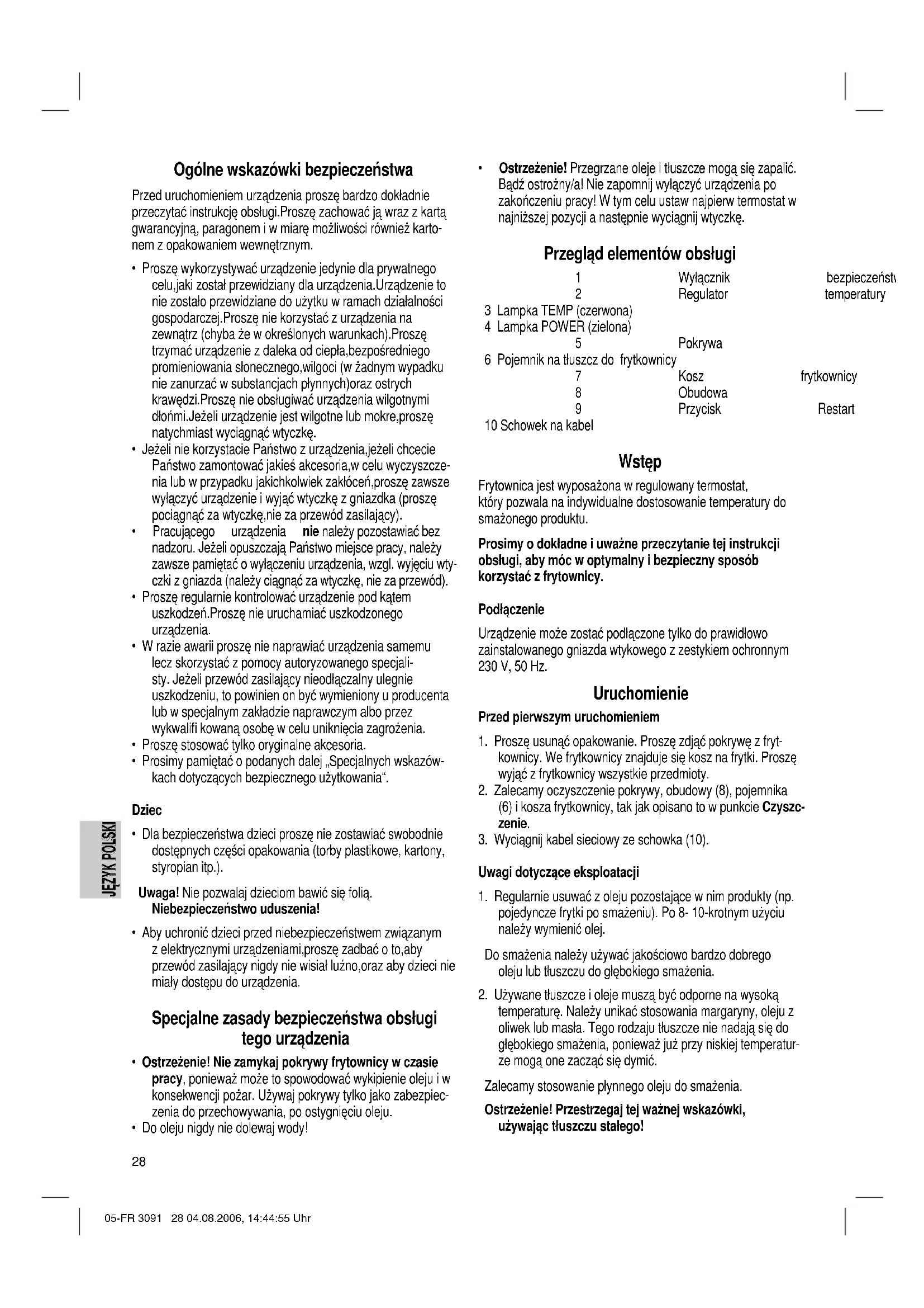 temperaturę. Należy unikać stosowania margaryny, oleju z oliwek lub masła. Tego rodzaju tłuszcze nie nadają się do głębokiego smażenia, ponieważ już przy niskiej temperatur- ze mogą one zacząć się dymić. Zalecamy stosowanie płynnego oleju do smażenia. Ostrzeżenie! Przestrzegaj tej ważnej wskazówki, używając tłuszczu stałego! 05-FR 3091 28 04.08.2006, 14:44:55 UhrJĘZYK POLSKI