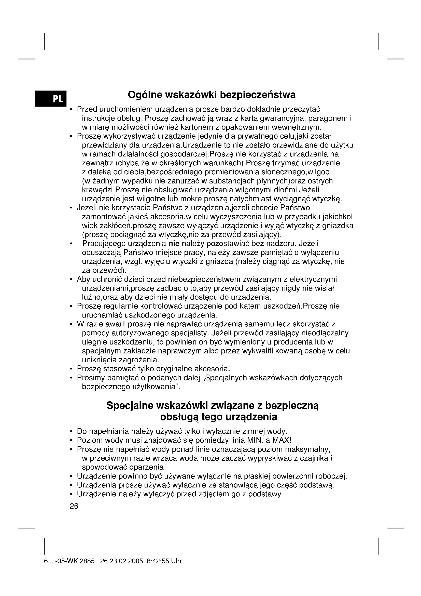 - Jeżeli urządzenie wyłącza się zanim zagotuje się woda, to odwapnianie należy przeprowadzić wcześniej. 6....-05-WK 2885 27 23.02.2005, 8:42:55 UhrPL
