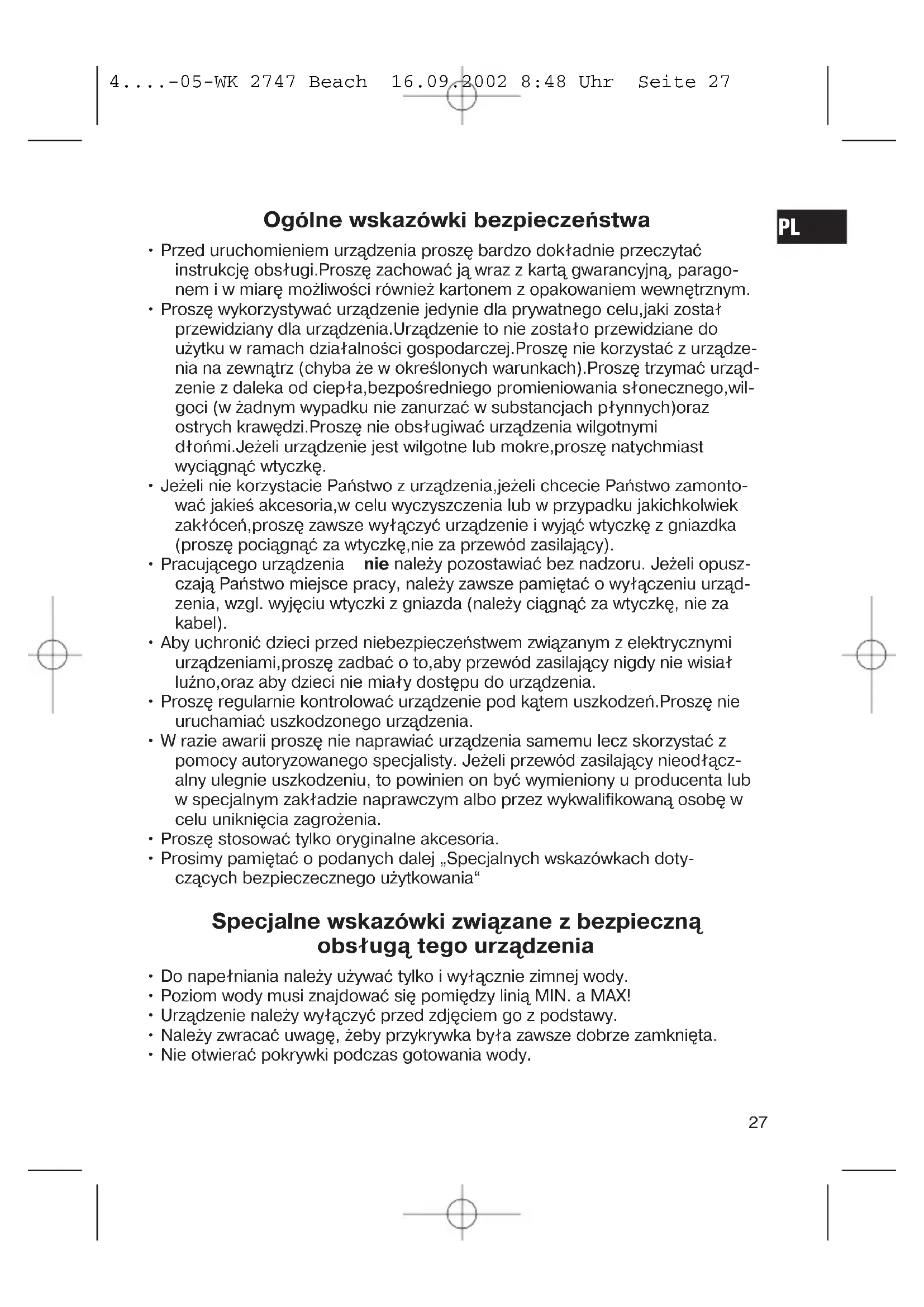 4....-05-WK 2747 Beach 16.09.2002 8:48 Uhr Seite 27Uruchomienie urządzenia Proszę uważnie przeczytać niniejszą instrukcję obsługi i odłożyć ją w bezpiecz- ne miejsce. Przed pierwszym użyciem proszę dwukrotnie zagotować w urządze- niu świeżą wodą - proszę stosować czystą wodę bez dodatków. Obsługa