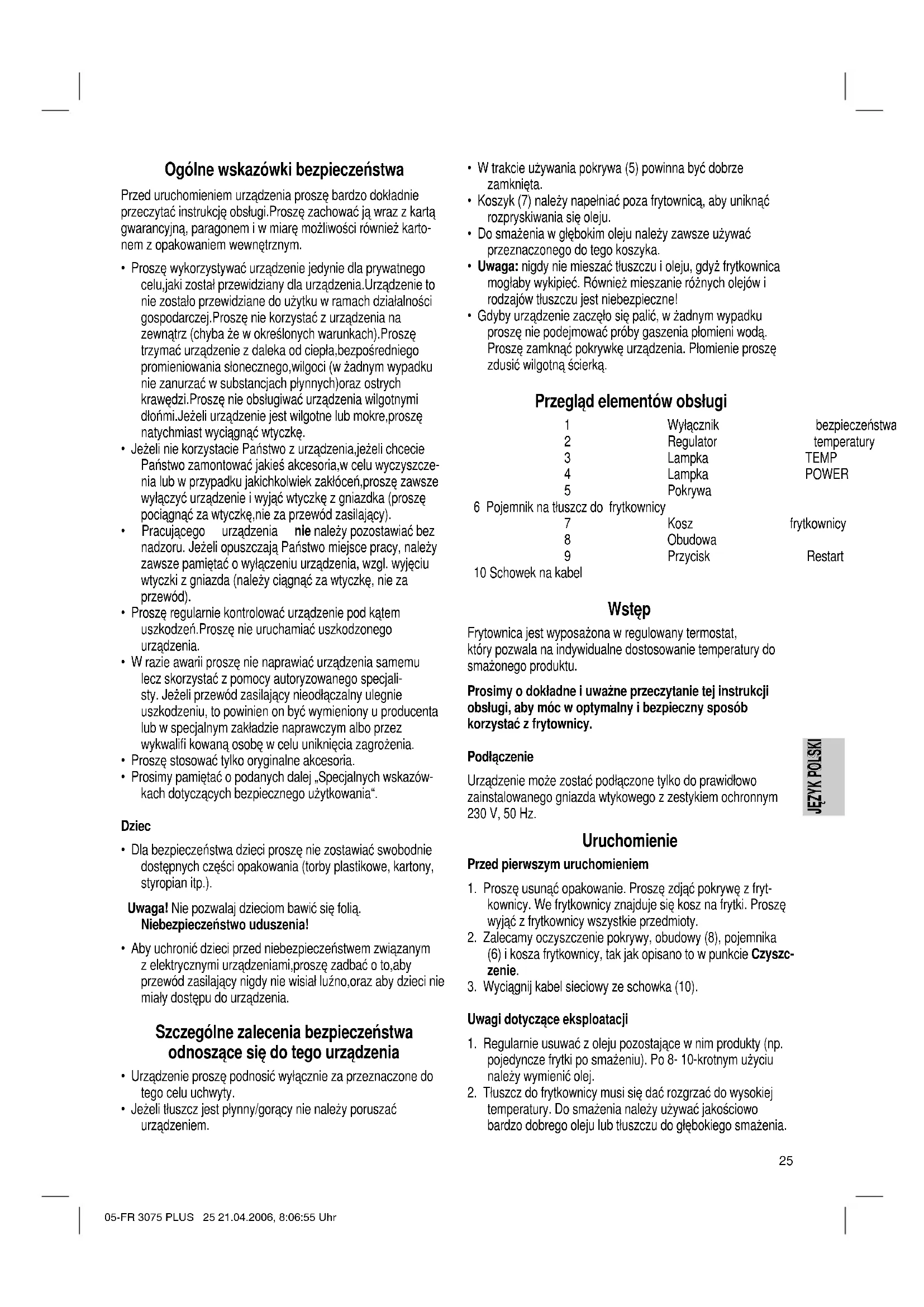 temperatury. Do smażenia należy używać jakościowo bardzo dobrego oleju lub tłuszczu do głębokiego smażenia. 05-FR 3075 PLUS 25 21.04.2006, 8:06:55 UhrJĘZYK POLSKI