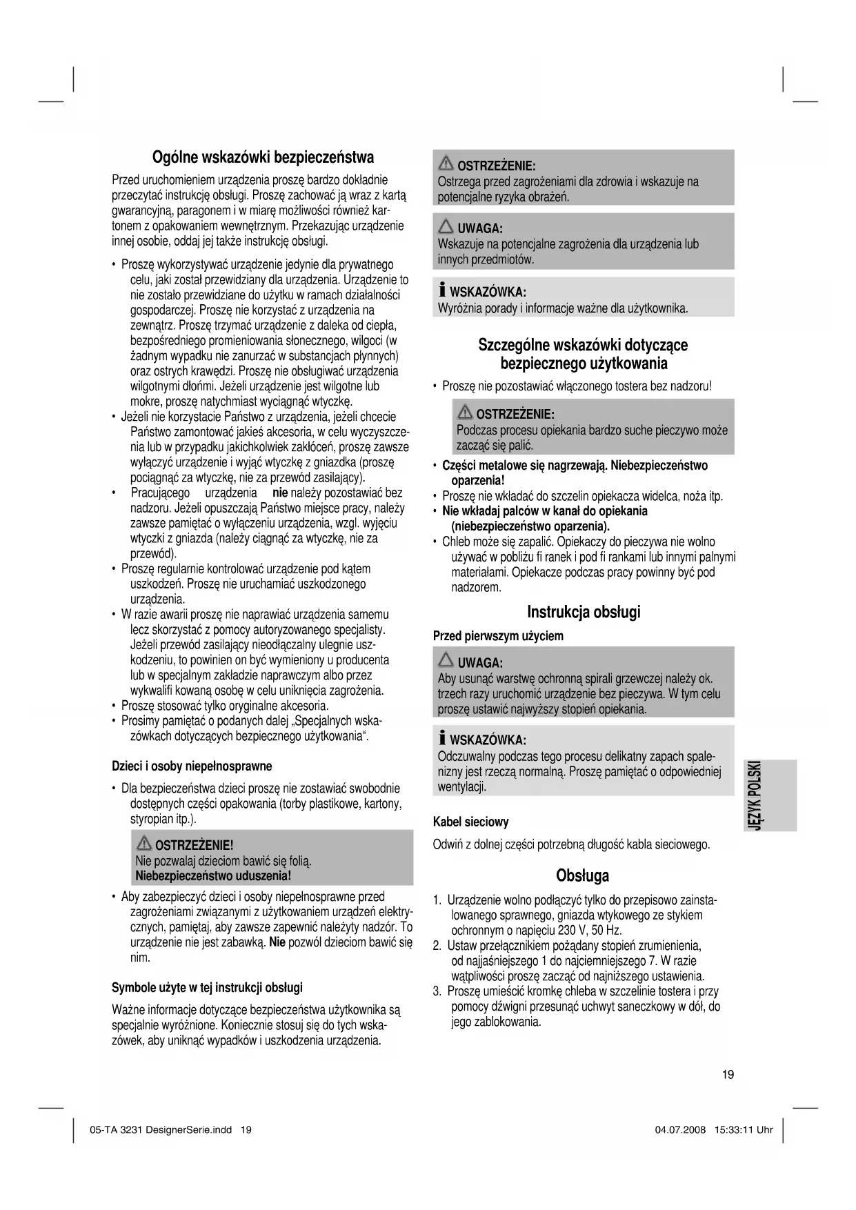 Tym sposobem pomagają Państwo unikać potencjalnych następstw niewłaściwego usuwania odpadów, mających wpływ na środowisko i zdrowie ludzi. Tą drogą przyczyniają się Państwo do ponownego użycia, do recyklingu i do innych form wykorzystania starego sprzętu elektrycznego i elektronicznego. Informacje, gdzie można zdać sprzęt, otrzymają Państwo w swoich urzędach komunalnych lub w administracji gminy. 05-TA 3231 DesignerSerie.indd 2105-TA 3231 DesignerSerie.indd 21 04.07.2008 15:33:12 Uhr04.07.2008 15:33:12 Uhr22 ČESKY ČESKY Všeobecné bezpečnostní pokyny Před uvedením tohoto přístroje do provozu si velmi pozorně přečtěte návod k obsluze a tento návod spolu se záručním lis- tem, pokladním blokem a podle možností i s obalem a vnitřním vybavením obalu dobře uschovejte. Pokud budete přístroj předávat třetím osobám, odevzdejte jim i tento návod k obsluze.