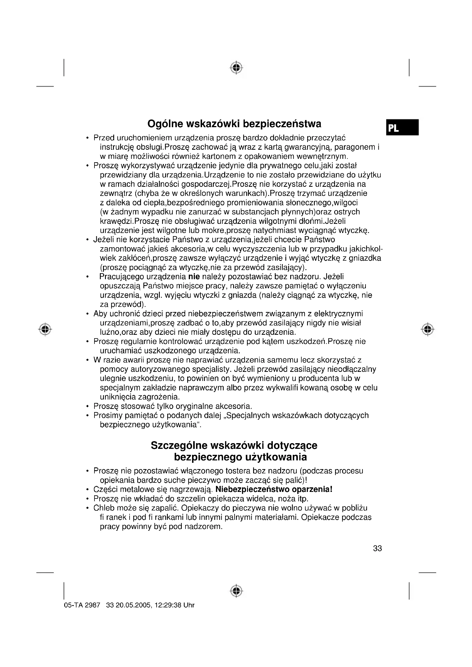 Proszne wkladać do szczelin opiekacza widelca, noza itp. - Chleb要去 Zapalić. Opiekacity do pieczywa nie wolno uzywac w poplizu fi ranek i pod fi rankami lub innymi palnymi materiały. Opiekacje podczas pracy powinny być pod nadzorem.