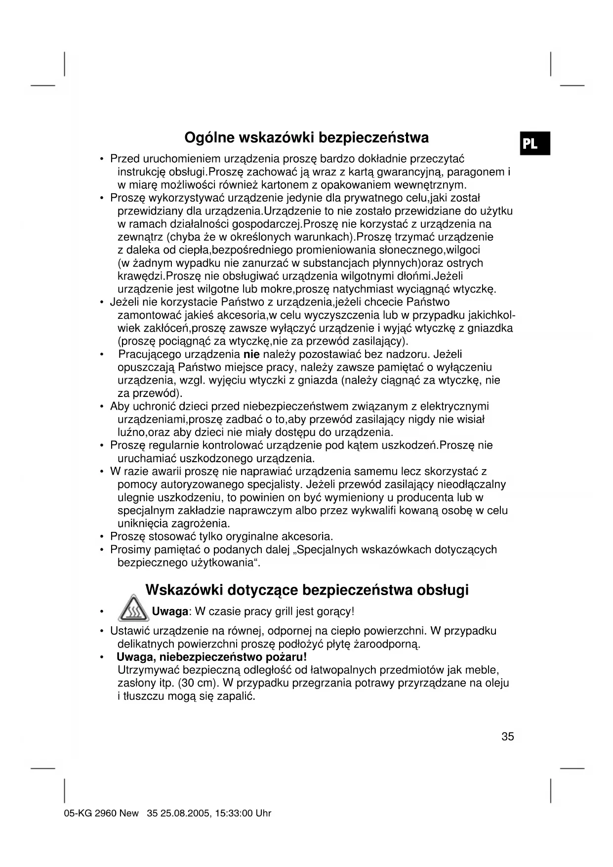 - Uwaga, niebezpieczeństwo pożaru! Utrzymywać bezpieczną odległość od łatwopalnych przedmiotów jak meble, zasłony itp. (30 cm). W przypadku przegrzania potrawy przyrządzane na oleju i tłuszczu mogą się zapalić. 05-KG 2960 New 35 25.08.2005, 15:33:00 UhrPL