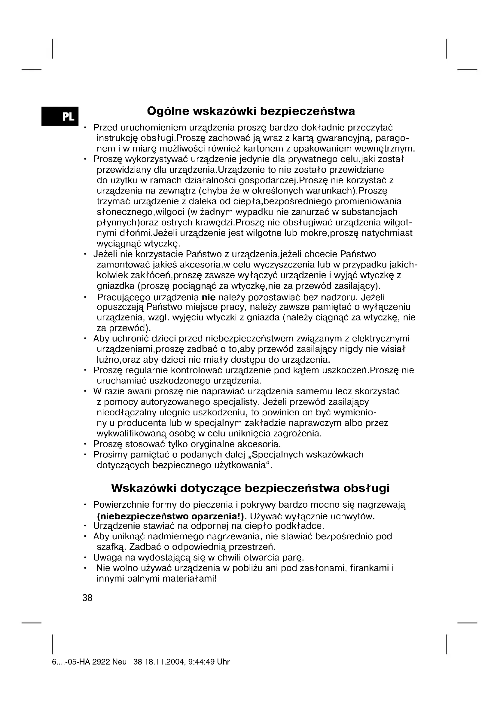 - Nie wolno używać urządzenia w pobliżu ani pod zasłonami, firankami i innymi palnymi materiałami! 6....-05-HA 2922 Neu 38 18.11.2004, 9:44:49 UhrPL