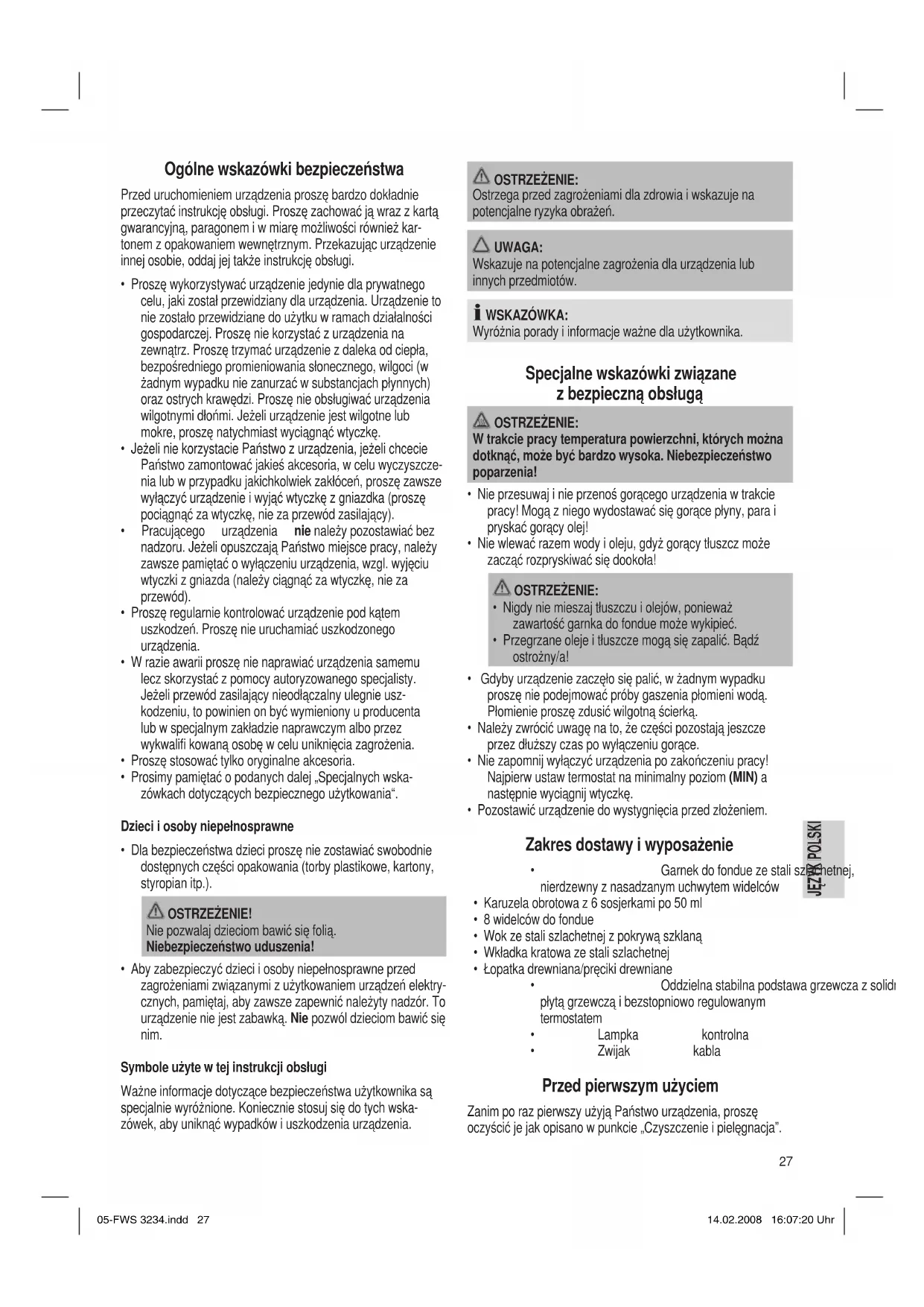 - Zwijak kabla Przed pierwszym użyciem Zanim po raz pierwszy użyją Państwo urządzenia, proszę oczyścić je jak opisano w punkcie „Czyszczenie i pielęgnacja”. 05-FWS 3234.indd 2705-FWS 3234.indd 27 14.02.2008 16:07:20 Uhr14.02.2008 16:07:20 Uhr28