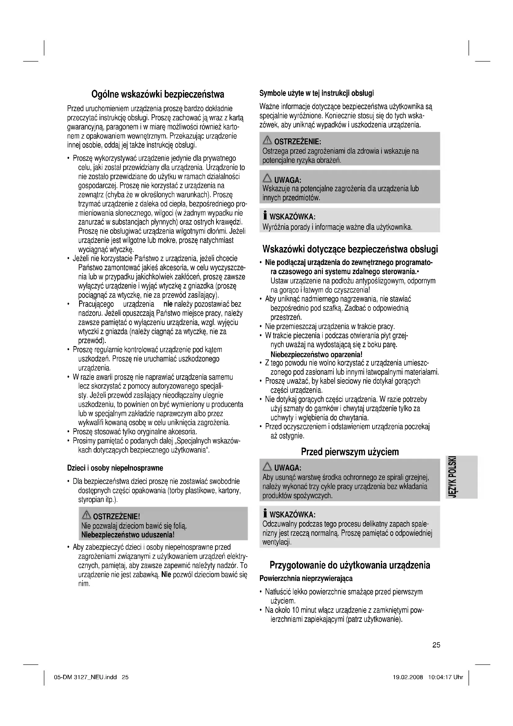 - Na około 10 minut włącz urządzenie z zamkniętymi pow- ierzchniami zapiekającymi (patrz użytkowanie). 05-DM 3127_NEU.indd 2505-DM 3127_NEU.indd 25 19.02.2008 10:04:17 Uhr19.02.2008 10:04:17 Uhr26