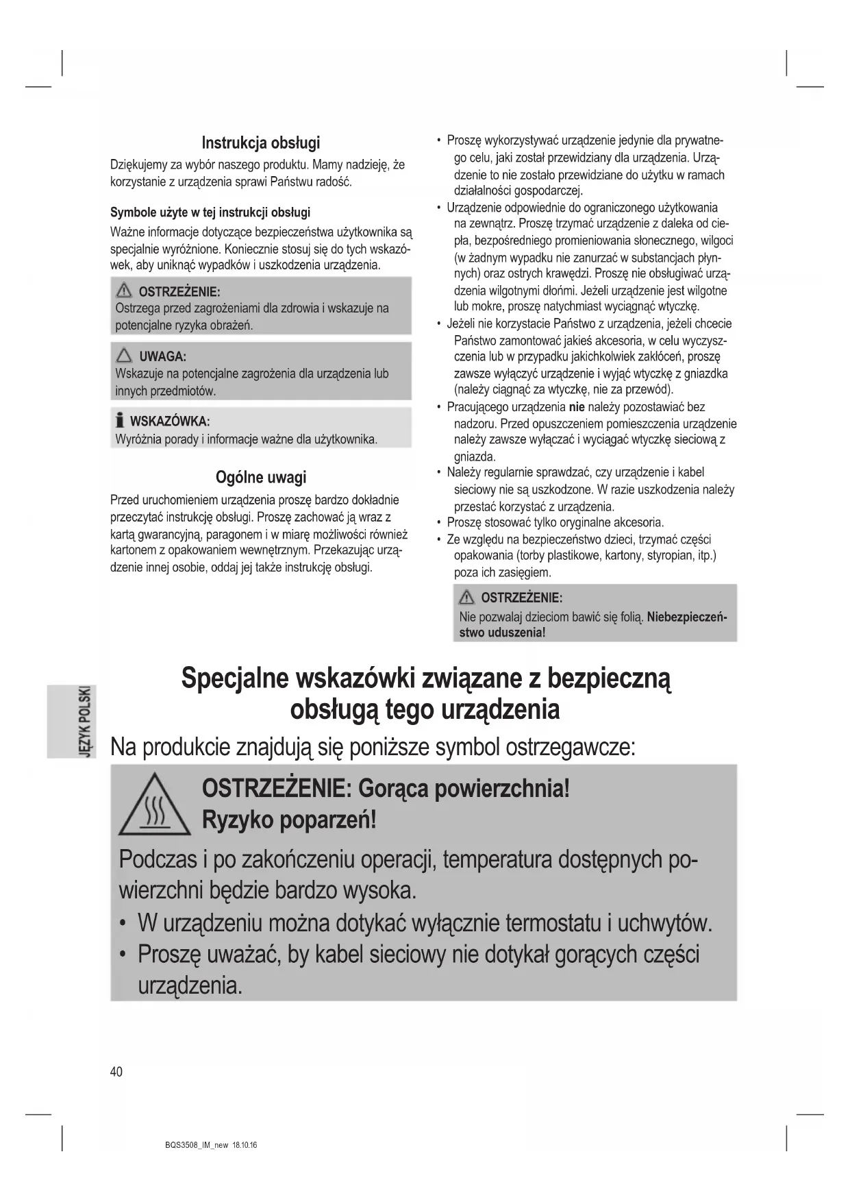 - Proszę uważać, by kabel sieciowy nie dotykał gorących części urządzenia.41 BQS3508_IM_new 18.10.16 OSTRZEŻENIE: Ryzyko przegrzania!