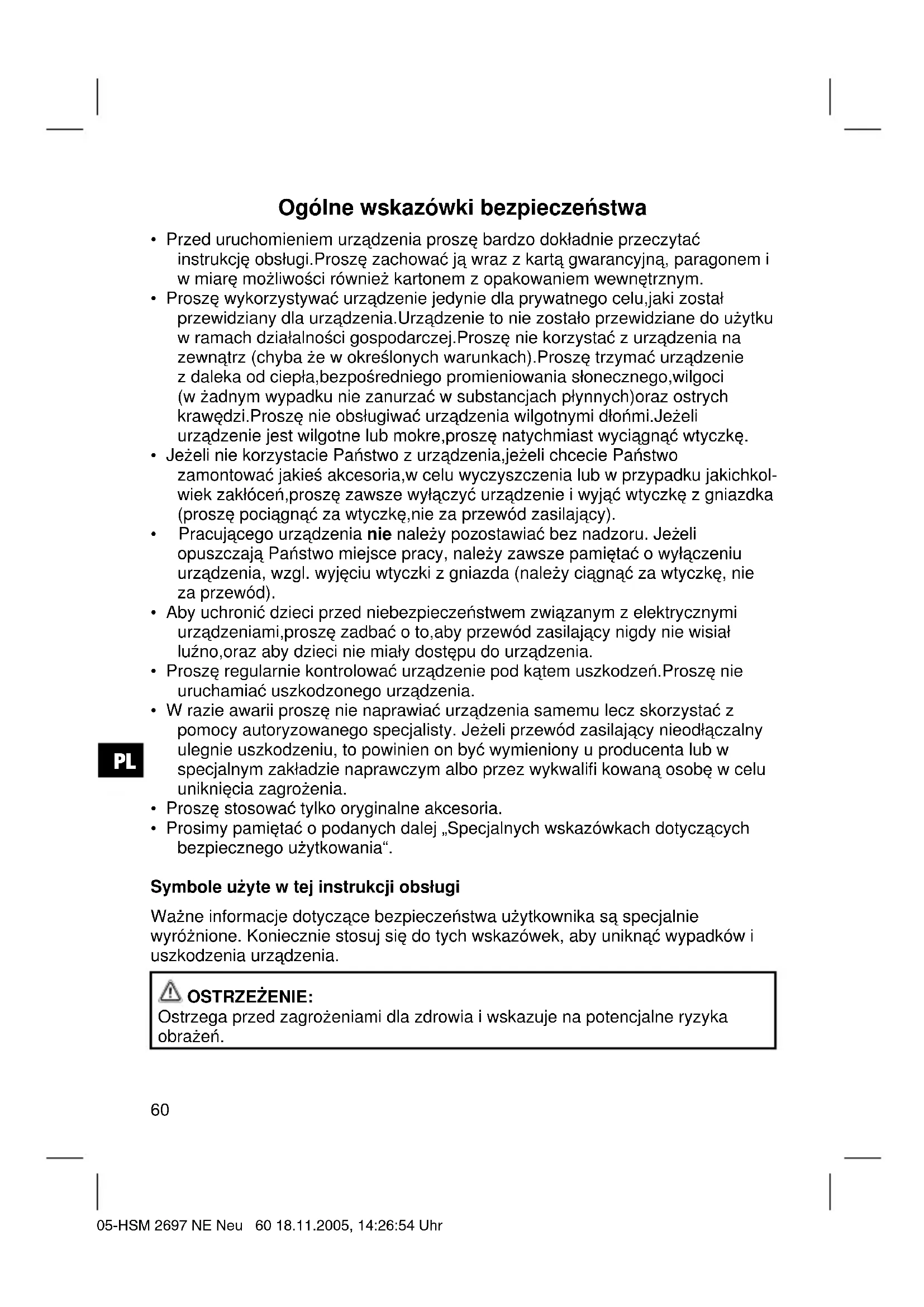 - Prosimy pamiętać o podanych dalej „Specjalnych wskazówkach dotyczących bezpiecznego użytkowania“. Symbole użyte w tej instrukcji obsługi Ważne informacje dotyczące bezpieczeństwa użytkownika są specjalnie wyróżnione. Koniecznie stosuj się do tych wskazówek, aby uniknąć wypadków i uszkodzenia urządzenia. OSTRZEŻENIE: Ostrzega przed zagrożeniami dla zdrowia i wskazuje na potencjalne ryzyka obrażeń. 05-HSM 2697 NE Neu 60 18.11.2005, 14:26:54 UhrPL