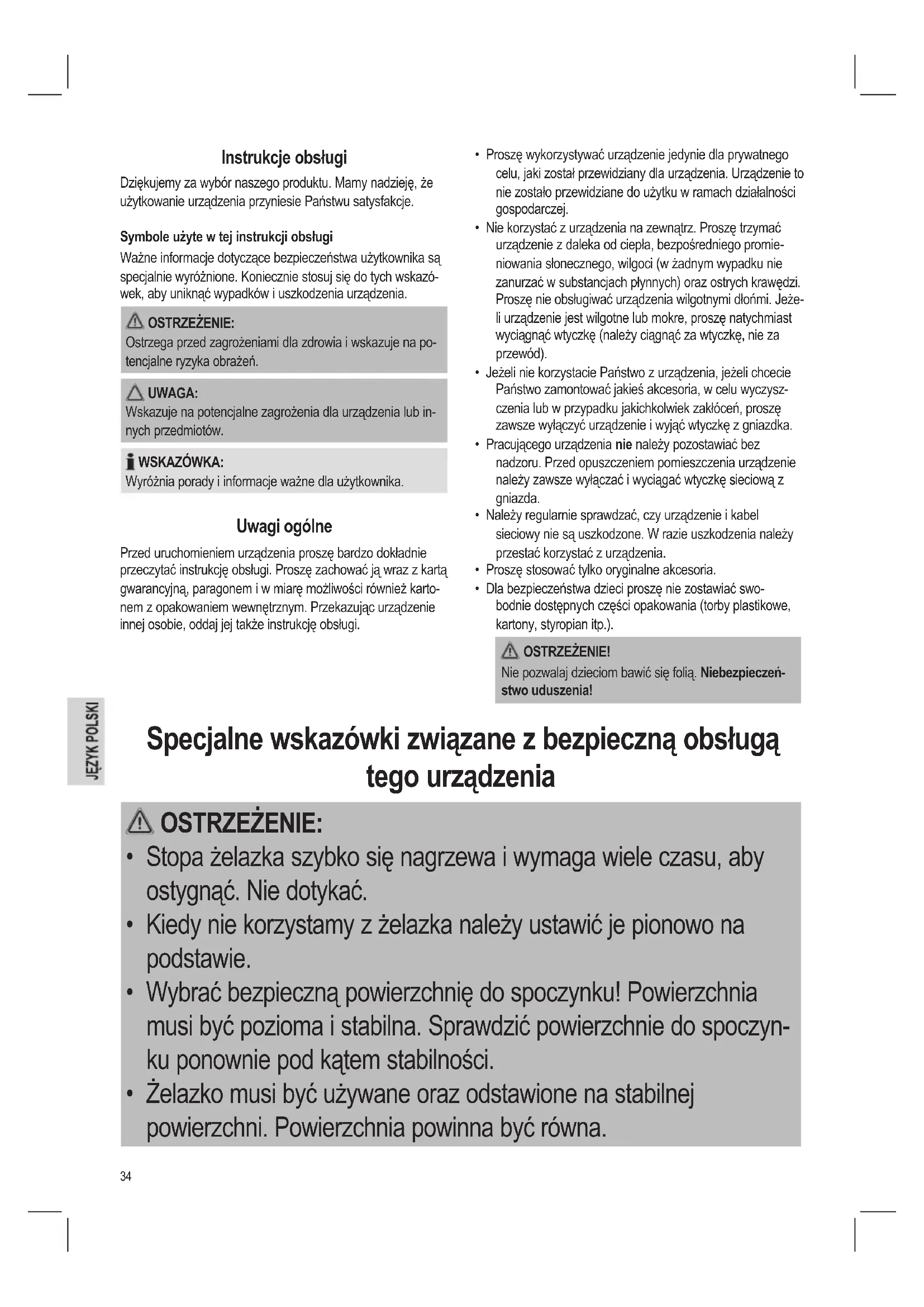 - Żelazko musi być używane oraz odstawione na stabilnej powierzchni. Powierzchnia powinna być równa.35 OSTRZEŻENIE: