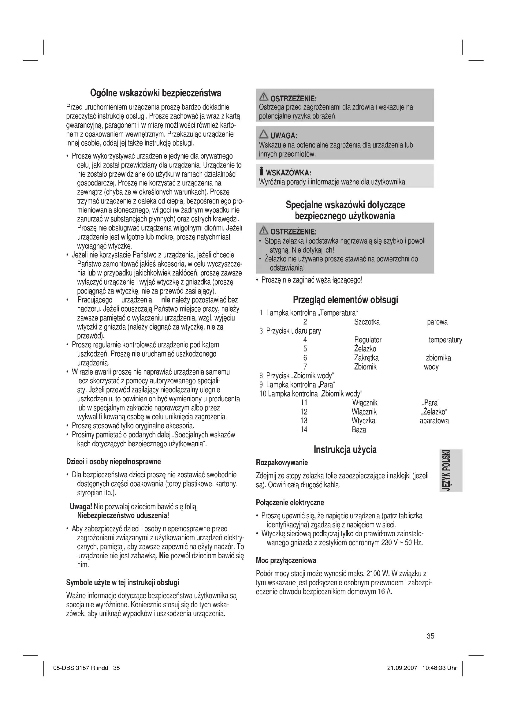 - Przyciśnij przycisk udaru pary i trzymaj wciśnięty przez ok. 1 minuty aż przes- tanie wyciekać woda Urządzenie nagle przestało działać w czasie pracy Przeciążenie obwodu prądowego? Sprawdź bezpiecznik w instalacji domowej 05-DBS 3187 R.indd 3705-DBS 3187 R.indd 37 21.09.2007 10:48:34 Uhr21.09.2007 10:48:34 Uhr38