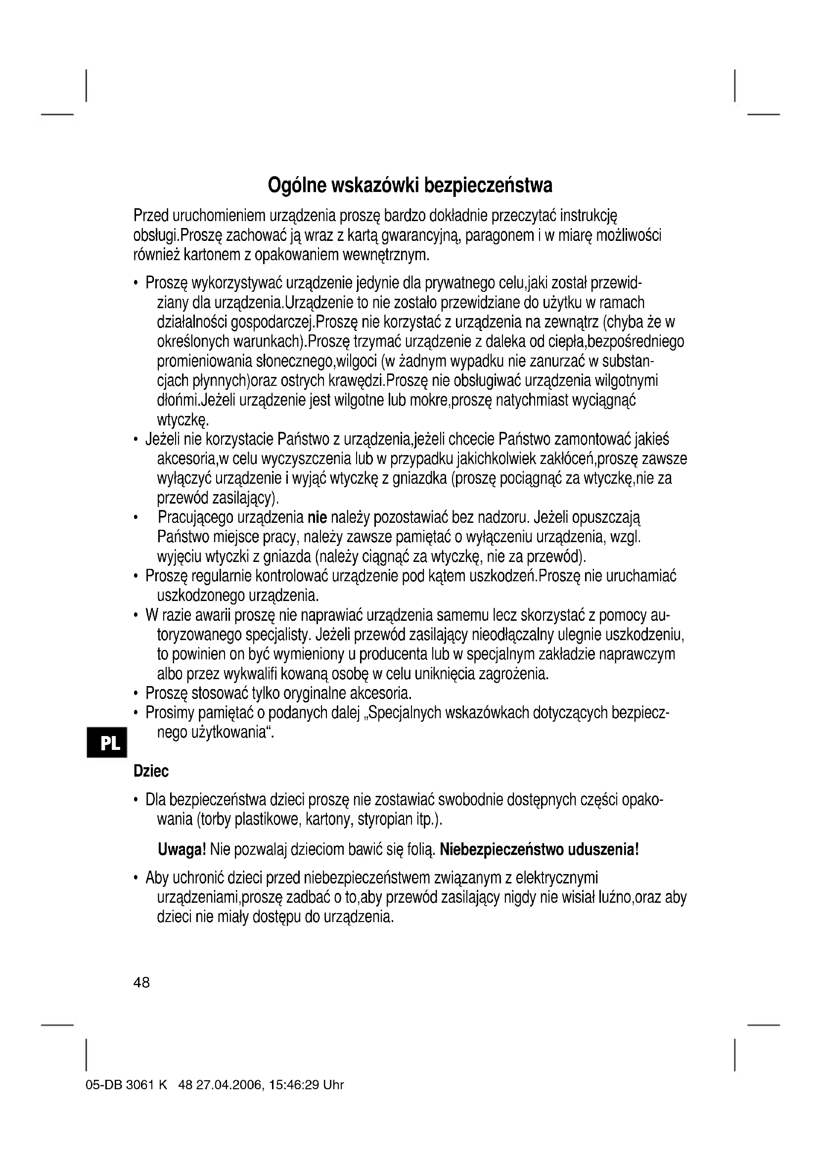 - Aby uchronić dzieci przed niebezpieczeństwem związanym z elektrycznymi urządzeniami,proszę zadbać o to,aby przewód zasilający nigdy nie wisiał luźno,oraz aby dzieci nie miały dostępu do urządzenia. 05-DB 3061 K 48 27.04.2006, 15:46:29 UhrPL