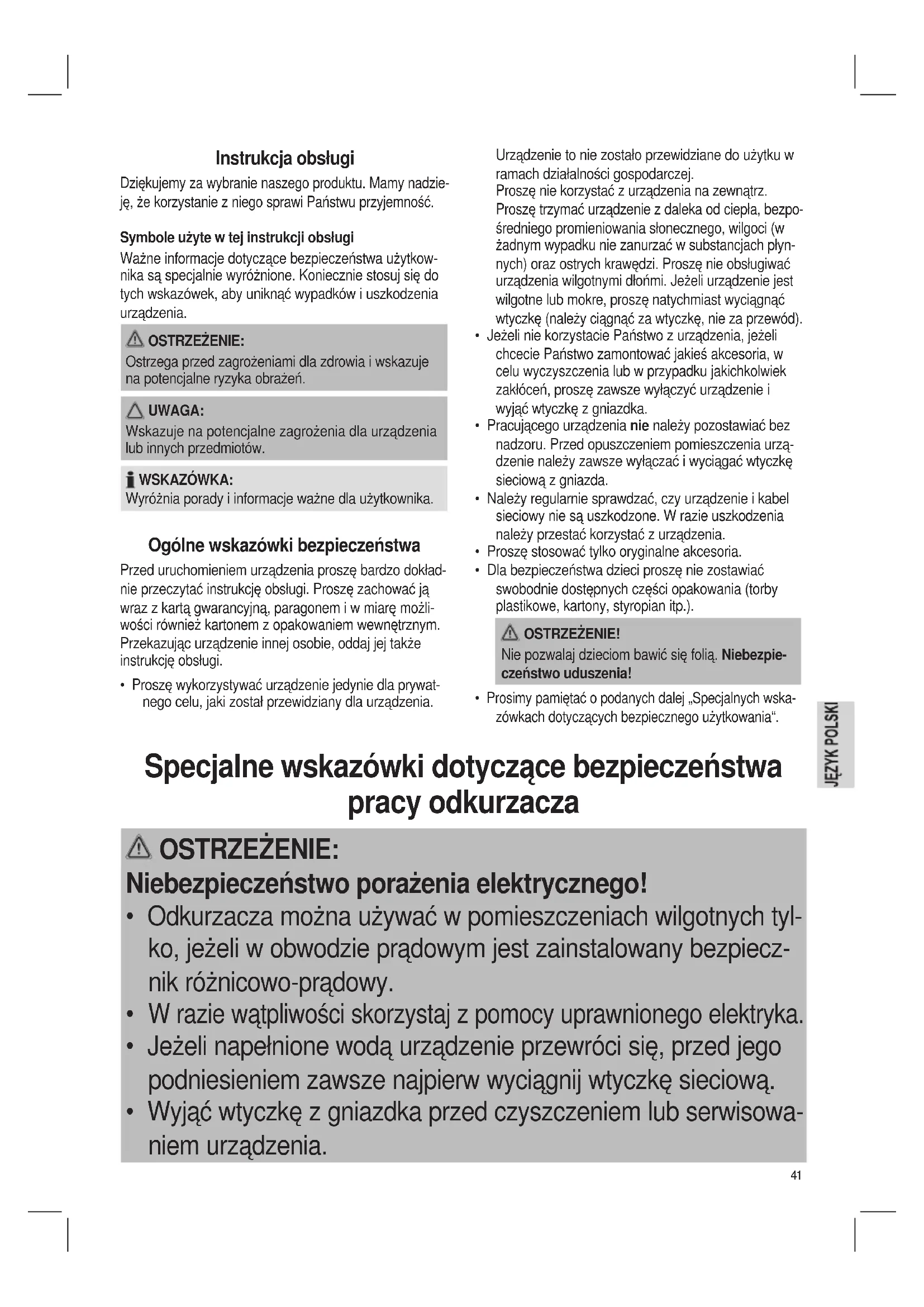 - Proszę wykorzystywać urządzenie jedynie dla prywat- nego celu, jaki został przewidziany dla urządzenia. Specjalne wskazówki dotyczące bezpieczeństwa pracy odkurzacza OSTRZEŻENIE: Niebezpieczeństwo porażenia elektrycznego!