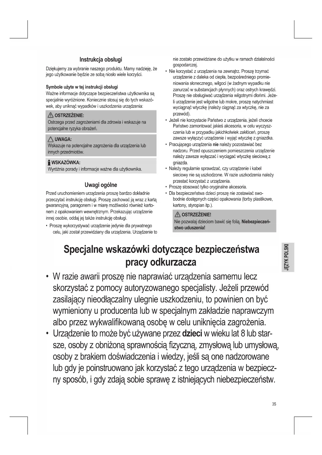- W razie awarii proszę nie naprawiać urządzenia samemu lecz skorzystać z pomocy autoryzowanego specjalisty. Jeżeli przewód zasilający nieodłączalny ulegnie uszkodzeniu, to powinien on być wymieniony u producenta lub w specjalnym zakładzie naprawczym albo przez wykwalikowaną osobę w celu uniknięcia zagrożenia.