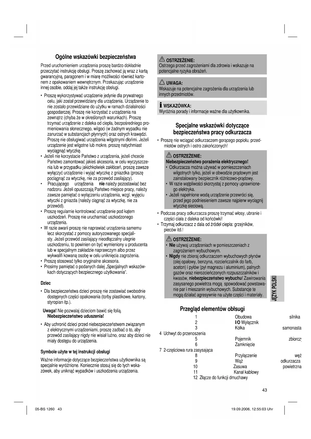 - Nigdy nie zbieraj odkurzaczem wybuchowych płynów (olej opałowy, benzyna, rozcieńczalnik do farb, aceton) i pyłów (pył magnezu i aluminium), palnych gazów oraz nierozcieńczonych rozpuszczalników i kwasów, niebezpieczeństwo wybuchu! Zawirowania zasysanego powietrza mogą spowodować powstawa- nie par i mieszanin wybuchowych. Substancje te mogą działać agresywnie na użyte części i materiały. Przegląd elementów obłsugi 1 Obudowa silnika 2 I/O Wyłącznik 3 Kółka samonastawcze 4 Uchwyt do przenoszenia 5 Pojemnik zbiorczy 6 Zamknięcie 7 2-częściowa rura zasysająca 8 Przyłączenie węża 9 Wąż odkurzacza 10 Zasuwa powietrzna 11 Kanał kablowy 12 Złącze do funkcji dmuchawy 05-BS 1260 43 19.09.2006, 12:55:03 Uhr44