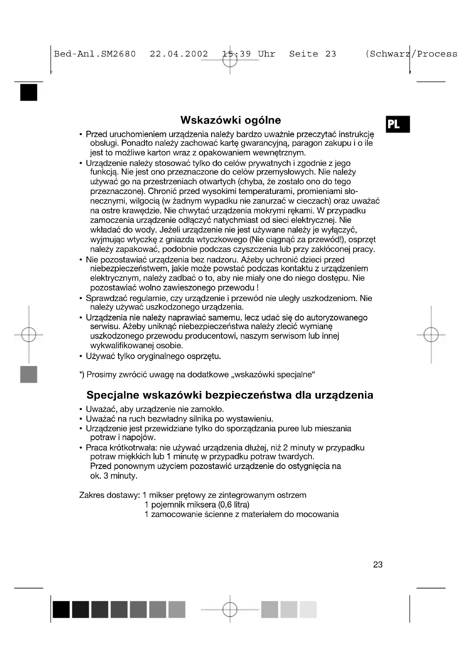 - Praca krótkotrwała: nie używać urządzenia dłużej, niż 2 minuty w przypadku potraw miękkich lub 1 minutę w przypadku potraw twardych. Przed ponownym użyciem pozostawić urządzenie do ostygnięcia na ok. 3 minuty. Zakres dostawy: 1 mikser prętowy ze zintegrowanym ostrzem 1 pojemnik miksera (0,6 litra) 1 zamocowanie ścienne z materiałem do mocowania
