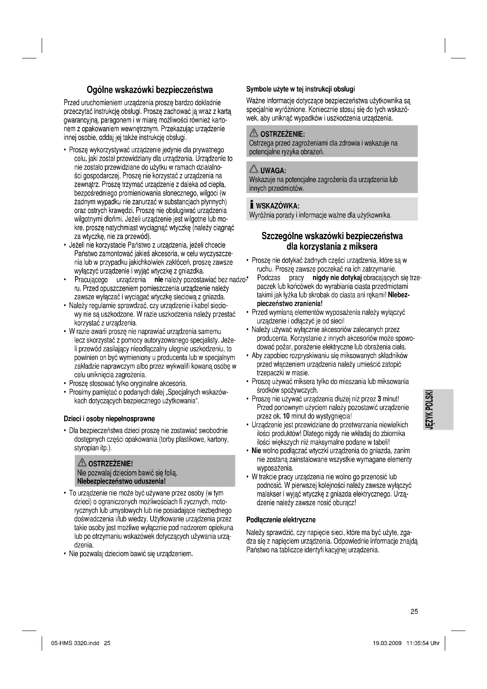 - W trakcie pracy urządzenia nie wolno go przenosić lub podnosić. W pierwszej kolejności należy zawsze wyłączyć malakser i wyjąć wtyczkę z gniazda elektrycznego. Urzą- dzenie należy zawsze nosić oburącz! Podłączenie elektryczne Należy sprawdzić, czy napięcie sieci, które ma być użyte, zga- dza się z napięciem urządzenia. Odpowiednie informacje znajdą Państwo na tabliczce identyfi kacyjnej urządzenia. 05-HMS 3320.indd 2505-HMS 3320.indd 25 19.03.2009 11:35:54 Uhr19.03.2009 11:35:54 Uhr26