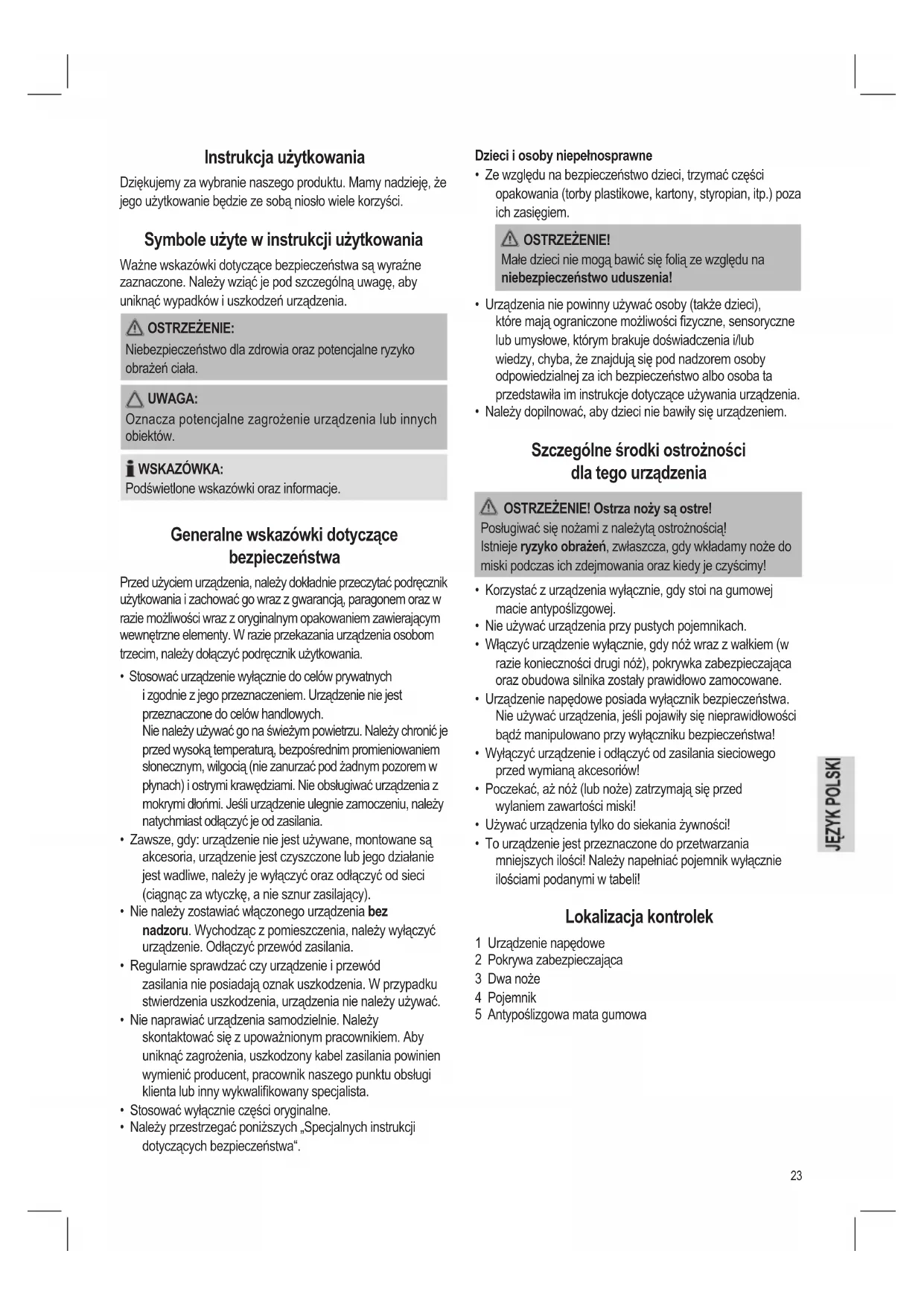 - To urządzenie jest przeznaczone do przetwarzania mniejszych ilości! Należy napełniać pojemnik wyłącznie ilościami podanymi w tabeli! Lokalizacja kontrolek 1 Urządzenie napędowe 2 Pokrywa zabezpieczająca 3 Dwa noże 4 Pojemnik 5 Antypoślizgowa mata gumowa Instrukcja użytkowania Dziękujemy za wybranie naszego produktu. Mamy nadzieję, że jego użytkowanie będzie ze sobą niosło wiele korzyści. Symbole użyte w instrukcji użytkowania Ważne wskazówki dotyczące bezpieczeństwa są wyraźne zaznaczone. Należy wziąć je pod szczególną uwagę, aby uniknąć wypadków i uszkodzeń urządzenia. OSTRZEŻENIE: Niebezpieczeństwo dla zdrowia oraz potencjalne ryzyko obrażeń ciała. UWAGA: Oznacza potencjalne zagrożenie urządzenia lub innych obiektów. WSKAZÓWKA: Podświetlone wskazówki oraz informacje. Generalne wskazówki dotyczące bezpieczeństwa Przed użyciem urządzenia, należy dokładnie przeczytać podręcznik użytkowania i zachować go wraz z gwarancją, paragonem oraz w razie możliwości wraz z oryginalnym opakowaniem zawierającym wewnętrzne elementy. W razie przekazania urządzenia osobom trzecim, należy dołączyć podręcznik użytkowania.