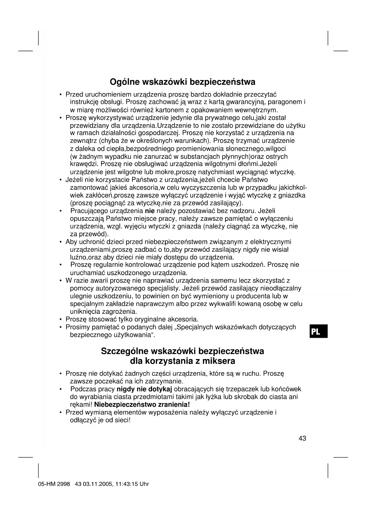 - Przed wymianą elementów wyposażenia należy wyłączyć urządzenie i odłączyć je od sieci! 05-HM 2998 43 03.11.2005, 11:43:15 UhrPL