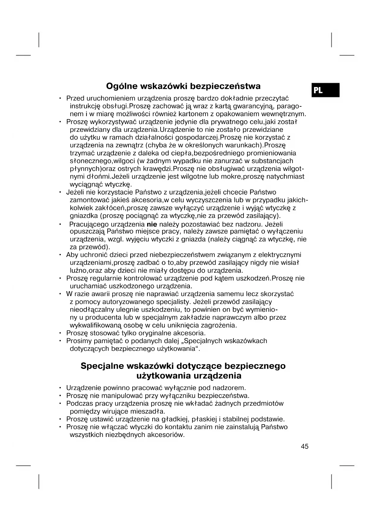 - Prosimy pamiętać o podanych dalej „Specjalnych wskazówkach dotyczących bezpiecznego użytkowania“. Specjalne wskazówki dotyczące bezpiecznego użytkowania urządzenia