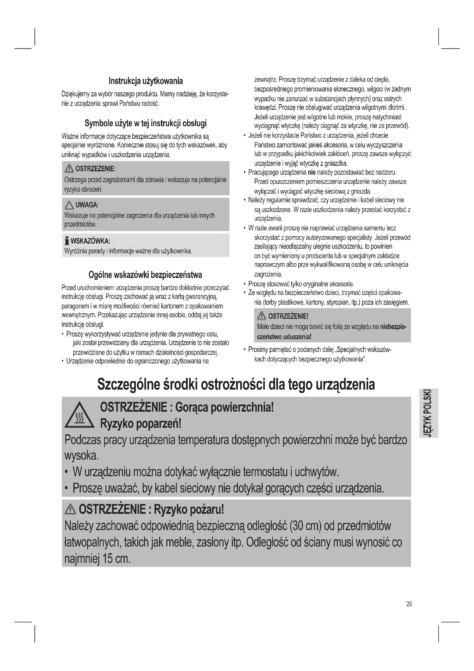 - Urządzenie odpowiednie do ograniczonego użytkowania na Szczególne środki ostrożności dla tego urządzenia OSTRZEŻENIE : Gorąca powierzchnia! Ryzyko poparzeń! Podczas pracy urządzenia temperatura dostępnych powierzchni może być bardzo wysoka.