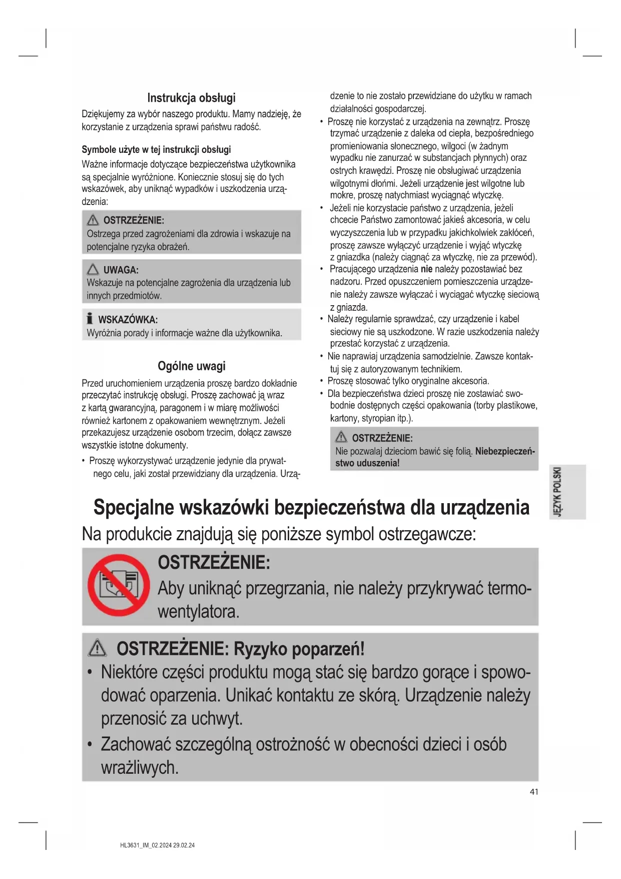 - Zachować szczególną ostrożność w obecności dzieci i osób wrażliwych.HL3631_IM_02.2024 29.02.24