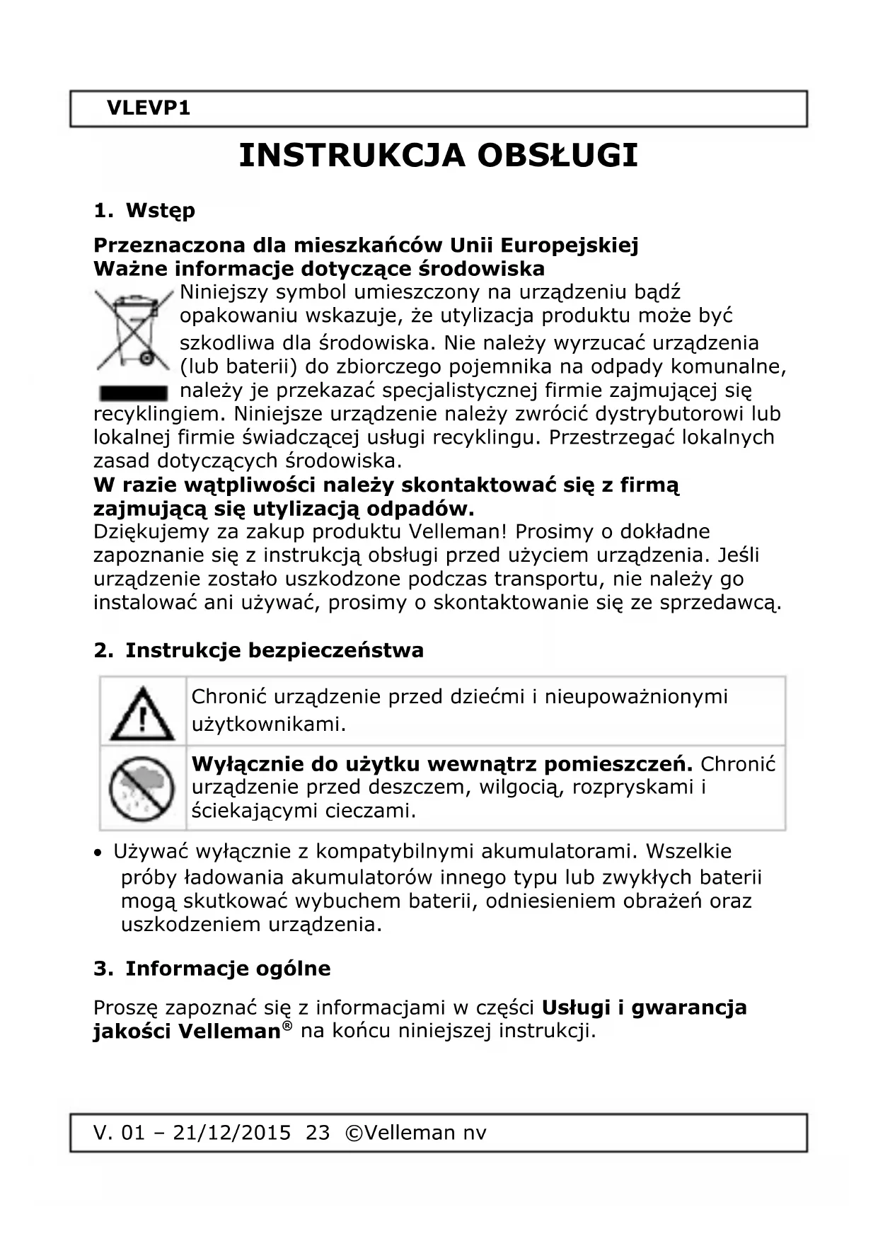 INSTRUKCJA OBSŁUGI VLEVP1 VELLEMAN