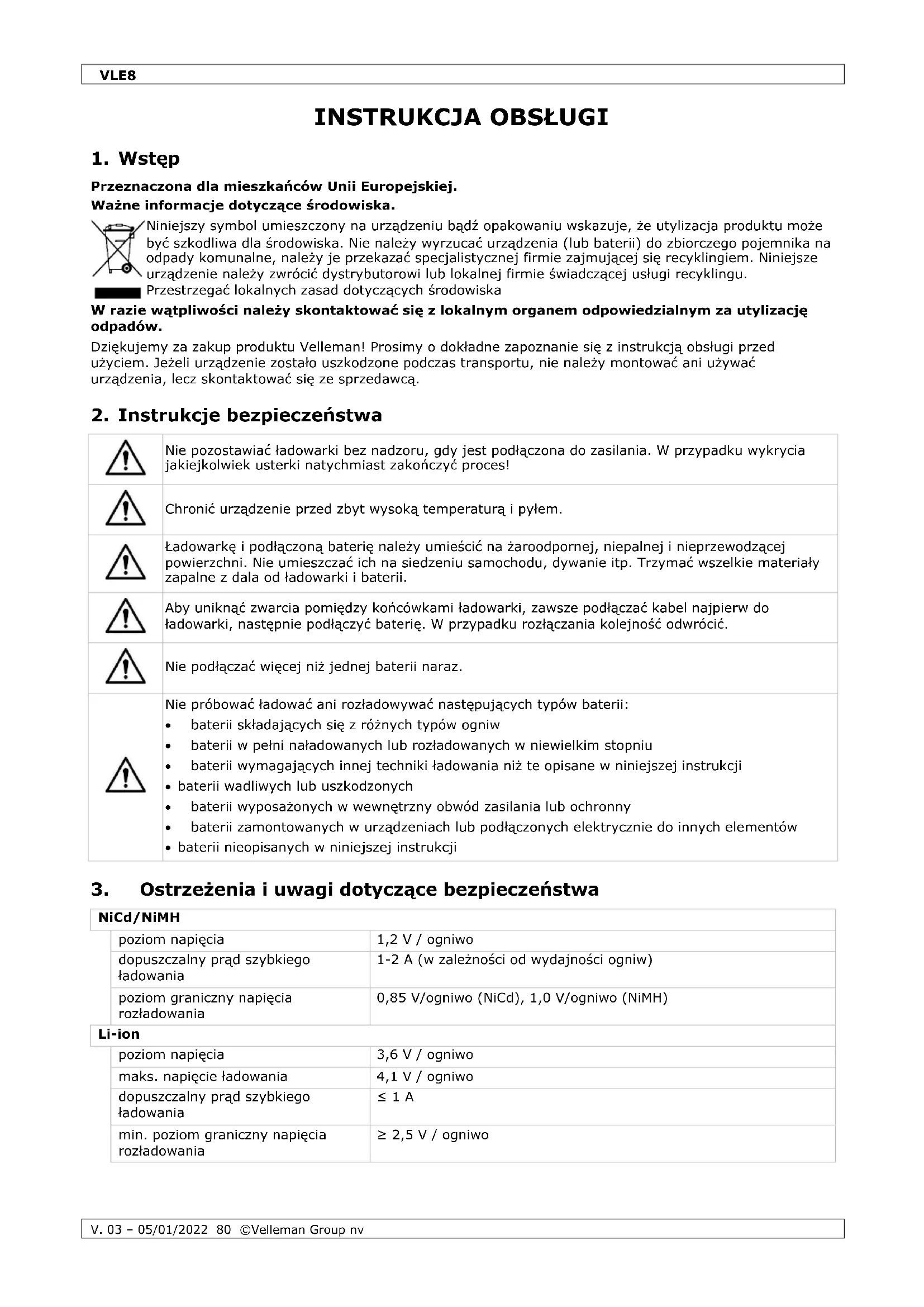 VLE8 - Ładowarka do baterii VELLEMAN - Bezpłatna instrukcja obsługi