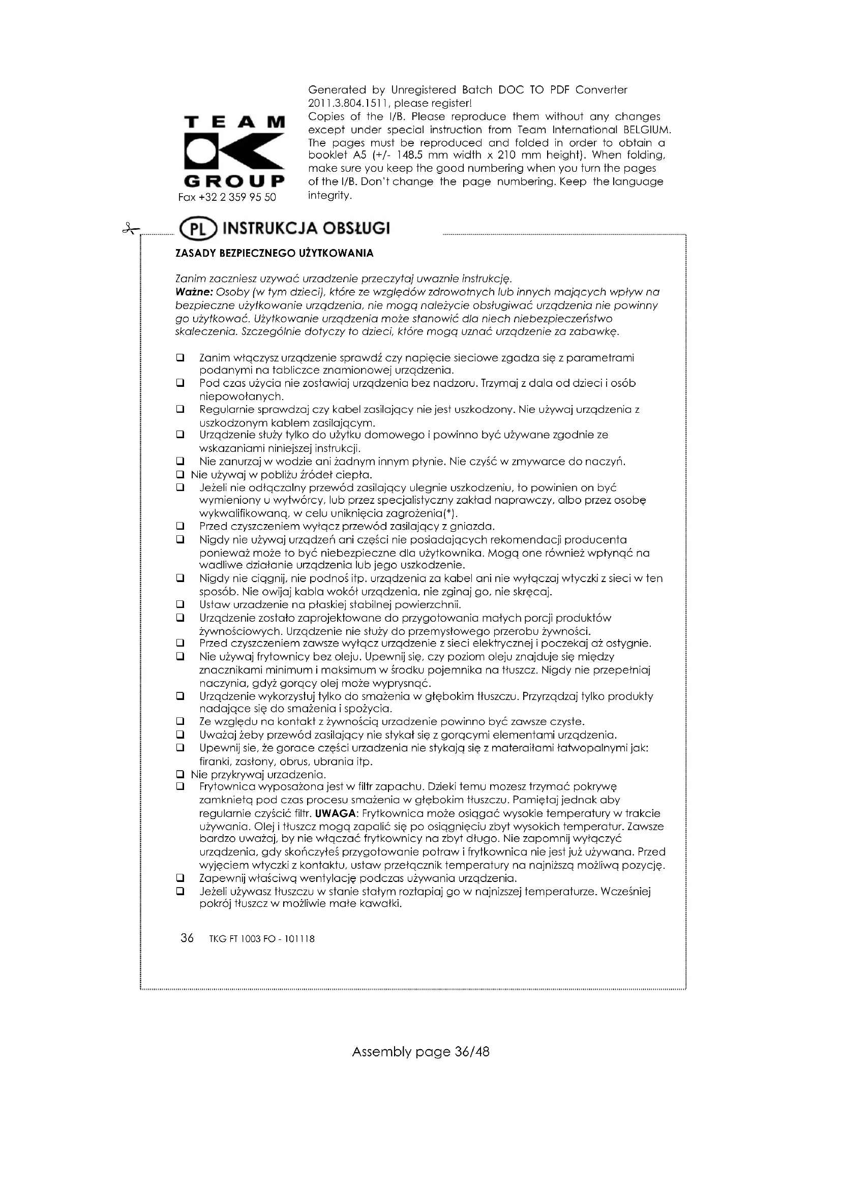 Zanim zaczniesz uzywać urzadzenie przeczytaj uwaznie instrukcję. Ważne: Osoby (w tym dzieci), które ze względów zdrowotnych lub innych mających wpływ na bezpieczne użytkowanie urządzenia, nie mogą należycie obsługiwać urządzenia nie powinny go użytkować. Użytkowanie urządzenia może stanowić dla niech niebezpieczeństwo skaleczenia. Szczególnie dotyczy to dzieci, które mogą uznać urządzenie za zabawkę. Zanim włączysz urządzenie sprawdź czy napięcie sieciowe zgadza się z parametrami podanymi na tabliczce znamionowej urządzenia. Pod czas użycia nie zostawiaj urządzenia bez nadzoru. Trzymaj z dala od dzieci i osób niepowołanych. Regularnie sprawdzaj czy kabel zasilający nie jest uszkodzony. Nie używaj urządzenia z uszkodzonym kablem zasilającym. Urządzenie służy tylko do użytku domowego i powinno być używane zgodnie ze wskazaniami niniejszej instrukcji. Nie zanurzaj w wodzie ani żadnym innym płynie. Nie czyść w zmywarce do naczyń. Nie używaj w pobliżu źródeł ciepła. Jeżeli nie odłączalny przewód zasilający ulegnie uszkodzeniu, to powinien on być wymieniony u wytwórcy, lub przez specjalistyczny zakład naprawczy, albo przez osobę wykwalifikowaną, w celu uniknięcia zagrożenia(*). Przed czyszczeniem wyłącz przewód zasilający z gniazda. Nigdy nie używaj urządzeń ani części nie posiadających rekomendacji producenta ponieważ może to być niebezpieczne dla użytkownika. Mogą one również wpłynąć na wadliwe działanie urządzenia lub jego uszkodzenie. Nigdy nie ciągnij, nie podnoś itp. urządzenia za kabel ani nie wyłączaj wtyczki z sieci w ten sposób. Nie owijaj kabla wokół urządzenia, nie zginaj go, nie skręcaj. Ustaw urzadzenie na płaskiej stabilnej powierzchnii. Urządzenie zostało zaprojektowane do przygotowania małych porcji produktów żywnościowych. Urządzenie nie służy do przemysłowego przerobu żywności. Przed czyszczeniem zawsze wyłącz urządzenie z sieci elektrycznej i poczekaj aż ostygnie. Nie używaj frytownicy bez oleju. Upewnij się, czy poziom oleju znajduje się między znacznikami minimum i maksimum w środku pojemnika na tłuszcz. Nigdy nie przepełniaj naczynia, gdyż gorący olej może wyprysnąć. Urządzenie wykorzystuj tylko do smażenia w głębokim tłuszczu. Przyrządzaj tylko produkty nadające się do smażenia i spożycia. Ze względu na kontakt z żywnością urzadzenie powinno być zawsze czyste. Uważaj żeby przewód zasilający nie stykał się z gorącymi elementami urządzenia. Upewnij sie, że gorace części urzadzenia nie stykają się z materaiłami łatwopalnymi jak: firanki, zasłony, obrus, ubrania itp. Nie przykrywaj urzadzenia. Frytownica wyposażona jest w filtr zapachu. Dzieki temu mozesz trzymać pokrywę zamknietą pod czas procesu smażenia w głębokim tłuszczu. Pamiętaj jednak aby regularnie czyścić filtr. UWAGA: Frytkownica może osiągać wysokie temperatury w trakcie używania. Olej i tłuszcz mogą zapalić się po osiągnięciu zbyt wysokich temperatur. Zawsze bardzo uważaj, by nie włączać frytkownicy na zbyt długo. Nie zapomnij wyłączyć urządzenia, gdy skończyłeś przygotowanie potraw i frytkownica nie jest już używana. Przed wyjęciem wtyczki z kontaktu, ustaw przełącznik temperatury na najniższą możliwą pozycję. Zapewnij właściwą wentylację podczas używania urządzenia. Jeżeli używasz tłuszczu w stanie stałym roztapiaj go w najnizszej temperaturze. Wcześniej pokrój tłuszcz w możliwie małe kawałki.Generated by Unregistered Batch DOC TO PDF Converter 2011.3.804.1511, please register! Copies of the I/B. Please reproduce them without any changes except under special instruction from Team International BELGIUM. The pages must be reproduced and folded in order to obtain a booklet A5 (+/- 148.5 mm width x 210 mm height). When folding, make sure you keep the good numbering when you turn the pages of the I/B. Don‟t change the page numbering. Keep the language integrity.