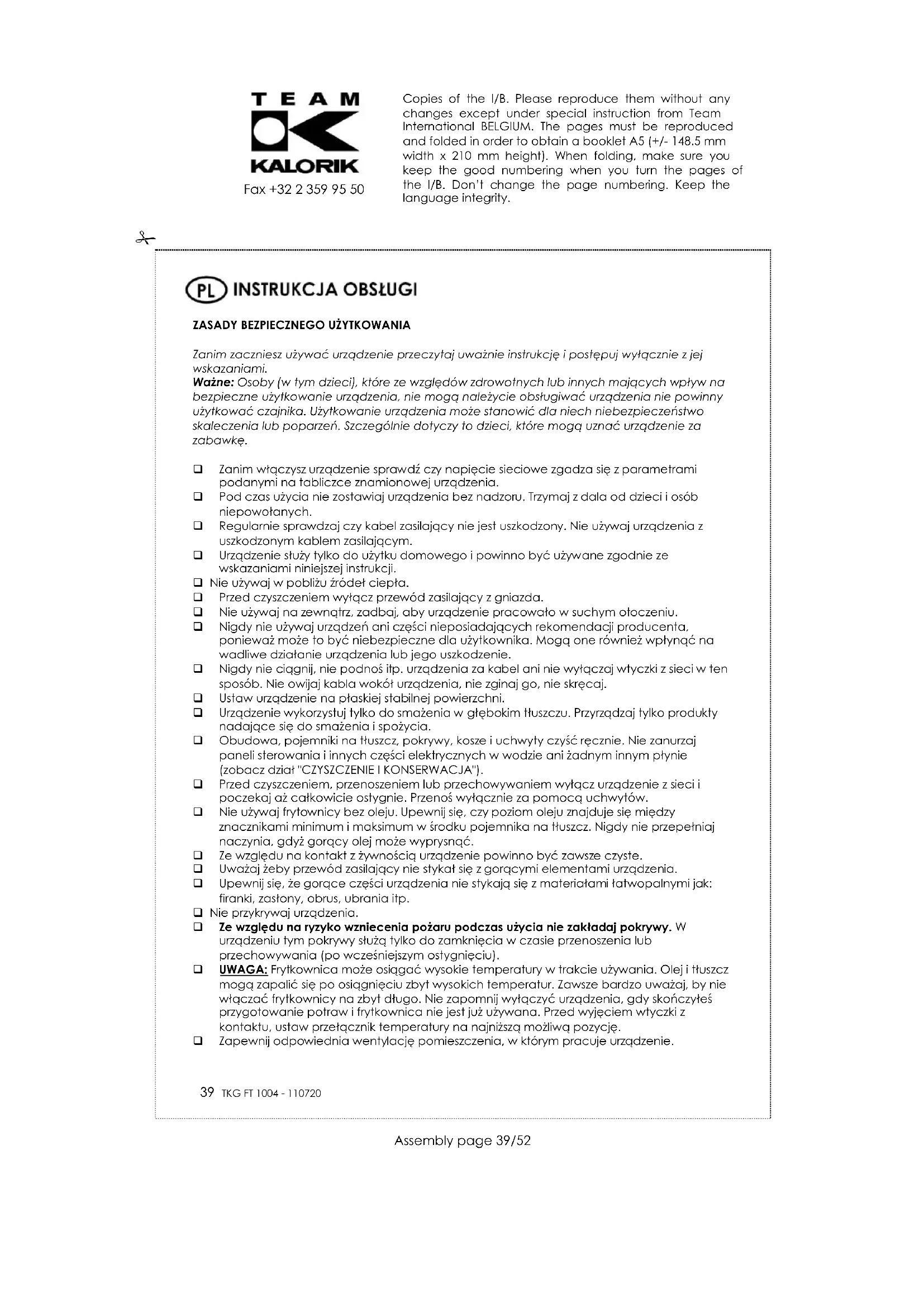 UWAGA: nigdy nie zanurzaj w wodzie ani żadnym innym płynie. Odłącz urządzenie z sieci. Poczekaj, aż urządzenie całkowicie ostygnie zanim zaczniesz czyszczenie. Rozmontuj urządzenie zgodnie z zasadami działu “DEMONTAŻ URZĄDZENIA”. Regularnie zmieniaj olej. W celu usunięcia starego oleju podstaw odpowiednie naczynie (plastikową butelkę…) pod kurek spustowy oleju i naciśnij plastikowy uchwyt z kranu równocześnie przekręcając go w przeciwnym kierunku niż ruch wskazówek zegaru. Kiedy misa jest pusta, tzn. gdy olej został wylany, można odkręcić kurek spustowy oleju I umyć w ciepłew wodzie z płynem. Nie używaj silnych detergentów i ścierających materiałów/płynów gdyż może to spowodować uszkodzenie urządzenia. Oczyść urządzenie ciepłą wodą z płynem. Pomocne może okazać się wymoczenie elementów przez krótki okres czasu. Dokładnie wytrzyj wszystkie części. Sprawdź czy wtyczki i kontakty są całkowicie suche. Czyść frytkownicę regularnie, wydłuży to okres jej przydatności. Copies of the I/B. Please reproduce them without any changes except under special instruction from Team International BELGIUM. The pages must be reproduced and folded in order to obtain a booklet A5 (+/- 148.5 mm width x 210 mm height). When folding, make sure you keep the good numbering when you turn the pages of the I/B. Don‟t change the page numbering. Keep the language integrity.