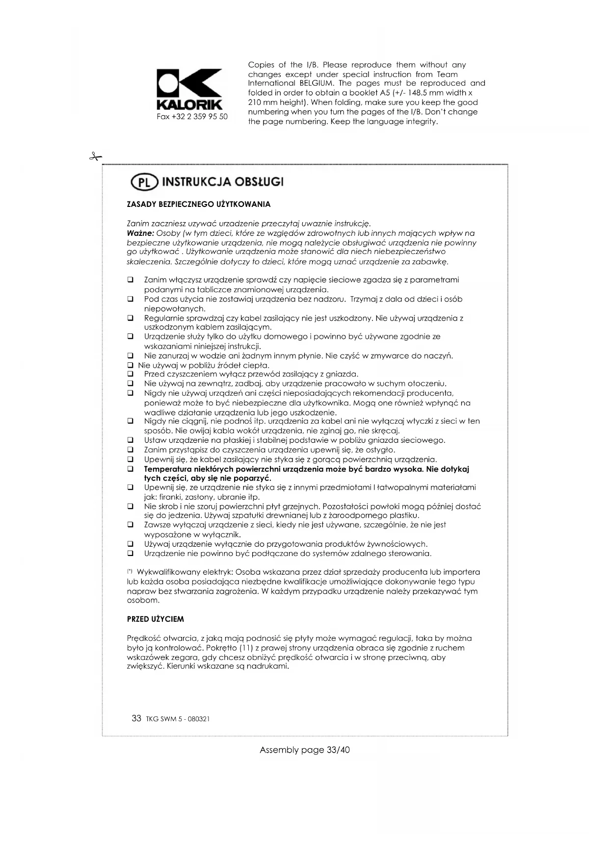 Symbol na tabliczce znamionowej urządzenia oznacza, że produktu nie wolno wyrzucać razem z innymi odpadami z gospodarstw domowych. Polskie prawo zabrania pod karą grzywny łączenia zużytego sprzętu elektrycznego i elektronicznego wraz z innymi odpadami. Dbając o pozbycie się produktu w należyty sposób, można zapobiec potencjalnym negatywnym skutkom dla środowiska naturalnego i zdrowia ludzkiego, jakie mogłyby wyniknąć z niewłaściwego postępowania z odpadami powstałymi ze zużytego sprzętu elektronicznego. System zbierania zużytego sprzętu jest zgodny z obowiązującymi na terenie Rzeczpospolitej Polskiej normami prawnymi, ( Ustawa z dnia 29 lipca 2005, Dziennik Ustaw Nr 180 poz.1494 i 1495) obowiązki wynikające z ustawy przejęła w imieniu przedsiębiorcy Organizacja Odzysku. Gospodarstwo domowe pełni istotną rolę w przyczynianiu się do ponownego użycia i odzysku, w tym recyklingu, zużytego sprzętu elektrycznego. Przestrzeganie zasad selektywnej zbiórki sprzętu ma zapewnić właściwy poziom ochrony zdrowia ludzkiego i środowiska naturalnego. Waga netto urządzenia- 3.40 kg Copies of the I/B. Please reproduce them without any changes except under special instruction from Team International BELGIUM. The pages must be reproduced and folded in order to obtain a booklet A5 (+/- 148.5 mm width x 210 mm height). When folding, make sure you keep the good numbering when you turn the pages of the I/B. Don’t change the page numbering. Keep the language integrity.