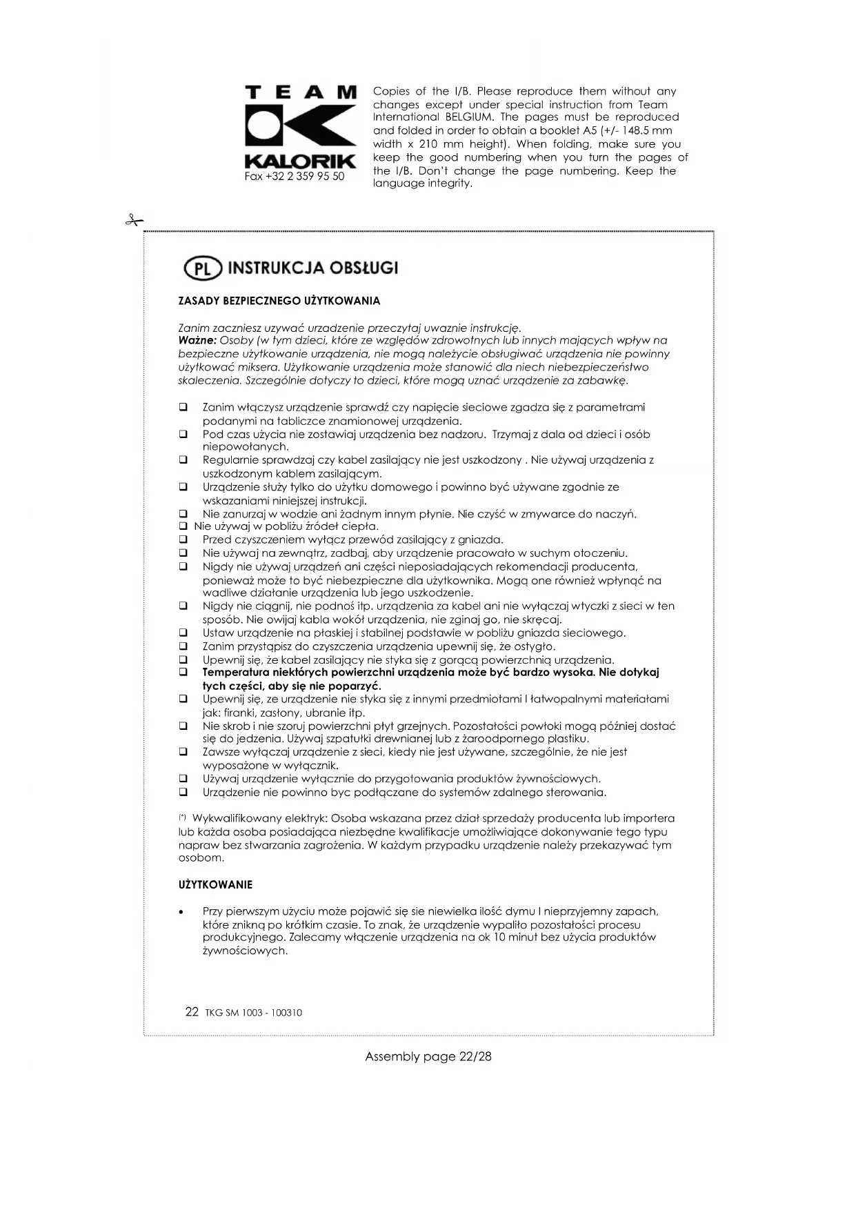 Symbol na tabliczce znamionowej urządzenia oznacza, że produktu nie wolno wyrzucać razem z innymi odpadami z gospodarstw domowych. Polskie prawo zabrania pod karą grzywny łączenia zużytego sprzętu elektrycznego i elektronicznego wraz z innymi odpadami. Dbając o pozbycie się produktu w należyty sposób, można zapobiec potencjalnym negatywnym skutkom dla środowiska naturalnego i zdrowia ludzkiego, jakie mogłyby wyniknąć z niewłaściwego postępowania z odpadami powstałymi ze zużytego sprzętu elektronicznego. System zbierania zużytego sprzętu jest zgodny z obowiązującymi na terenie Rzeczpospolitej Polskiej normami prawnymi, ( Ustawa z dnia 29 lipca 2005, Dziennik Ustaw Nr 180 poz.1494 i 1495) obowiązki wynikające z ustawy przejęła w imieniu przedsiębiorcy Organizacja Odzysku. Gospodarstwo domowe pełni istotną rolę w przyczynianiu się do ponownego użycia i odzysku, w tym recyklingu, zużytego sprzętu elektrycznego. Przestrzeganie zasad selektywnej zbiórki sprzętu ma zapewnić właściwy poziom ochrony zdrowia ludzkiego i środowiska naturalnego. Waga netto urządzenia- 1.40 kg Copies of the I/B. Please reproduce them without any changes except under special instruction from Team International BELGIUM. The pages must be reproduced and folded in order to obtain a booklet A5 (+/- 148.5 mm width x 210 mm height). When folding, make sure you keep the good numbering when you turn the pages of the I/B. Don’t change the page numbering. Keep the language integrity.