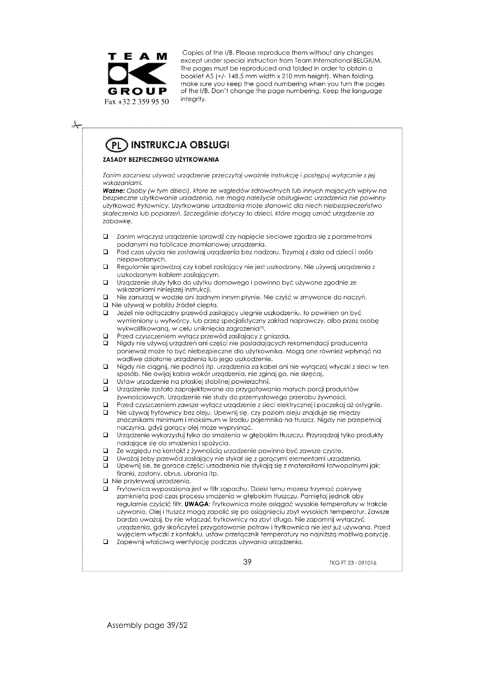 UWAGA: nigdy nie zanurzaj w wodzie ani żadnym innym płynie. Odłącz urządzenie z sieci. Poczekaj, aż urządzenie całkowicie ostygnie zanim zaczniesz czyszczenie. Rozmontuj urządzenie zgodnie z zasadami działu “DEMONTAŻ URZĄDZENIA”. Nie używaj silnych detergentów i ścierających materiałów/płynów gdyż może to spowodować uszkodzenie urządzenia. Oczyść urządzenie ciepłą wodą z płynem. Pomocne może okazać się wymoczenie elementów przez krótki okres czasu. Dokładnie wytrzyj wszystkie części. Sprawdź czy wtyczki i kontakty są całkowicie suche. Regularnie zmieniaj olej. Czyść frytkownicę regularnie. To wydłuży okres jej przydatności.Copies of the I/B. Please reproduce them without any changes except under special instruction from Team International BELGIUM. The pages must be reproduced and folded in order to obtain a booklet A5 (+/- 148.5 mm width x 210 mm height). When folding, make sure you keep the good numbering when you turn the pages of the I/B. Don‟t change the page numbering. Keep the language integrity.