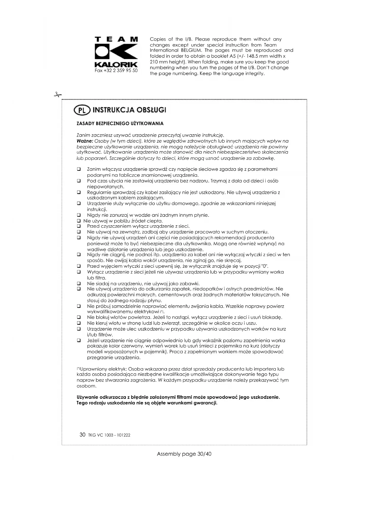 INSTRUKCJA OBSŁUGI TKG VC 1003 KALORIK