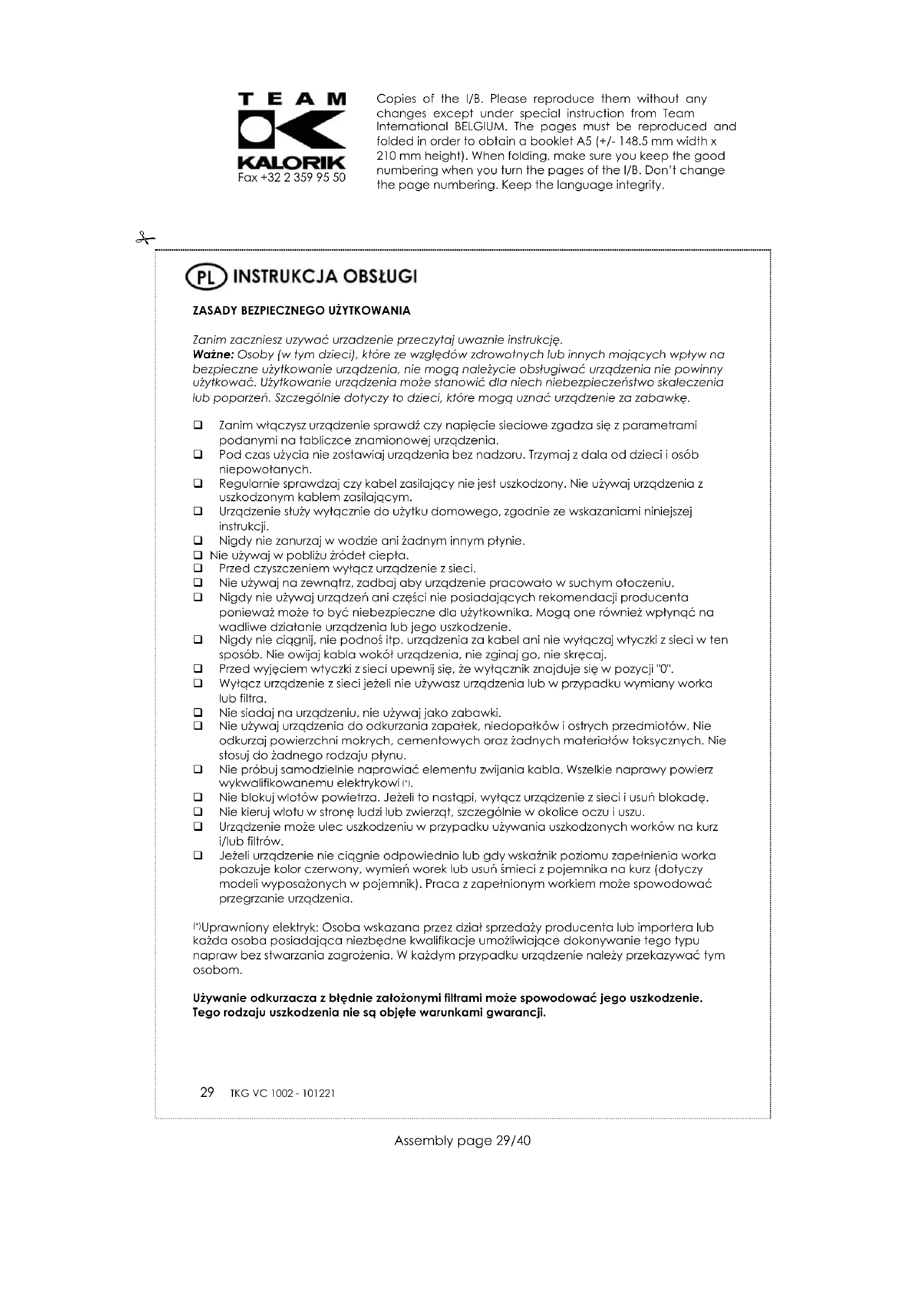 INSTRUKCJA OBSŁUGI TKG VC 1002 KALORIK