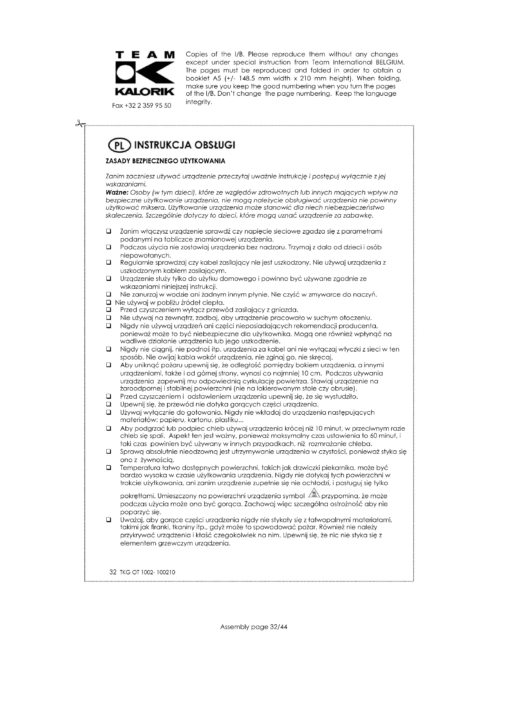 Zanim zaczniesz używać urządzenie przeczytaj uważnie instrukcję i postępuj wyłącznie z jej wskazaniami. Ważne: Osoby (w tym dzieci), które ze względów zdrowotnych lub innych mających wpływ na bezpieczne użytkowanie urządzenia, nie mogą należycie obsługiwać urządzenia nie powinny użytkować miksera. Użytkowanie urządzenia może stanowić dla niech niebezpieczeństwo skaleczenia. Szczególnie dotyczy to dzieci, które mogą uznać urządzenie za zabawkę. Zanim włączysz urządzenie sprawdź czy napięcie sieciowe zgadza się z parametrami podanymi na tabliczce znamionowej urządzenia. Podczas użycia nie zostawiaj urządzenia bez nadzoru. Trzymaj z dala od dzieci i osób niepowołanych. Regularnie sprawdzaj czy kabel zasilający nie jest uszkodzony. Nie używaj urządzenia z uszkodzonym kablem zasilającym. Urządzenie służy tylko do użytku domowego i powinno być używane zgodnie ze wskazaniami niniejszej instrukcji. Nie zanurzaj w wodzie ani żadnym innym płynie. Nie czyść w zmywarce do naczyń. Nie używaj w pobliżu źródeł ciepła. Przed czyszczeniem wyłącz przewód zasilający z gniazda. Nie używaj na zewnątrz, zadbaj, aby urządzenie pracowało w suchym otoczeniu. Nigdy nie używaj urządzeń ani części nieposiadających rekomendacji producenta, ponieważ może to być niebezpieczne dla użytkownika. Mogą one również wpłynąć na wadliwe działanie urządzenia lub jego uszkodzenie. Nigdy nie ciągnij, nie podnoś itp. urządzenia za kabel ani nie wyłączaj wtyczki z sieci w ten sposób. Nie owijaj kabla wokół urządzenia, nie zginaj go, nie skręcaj. Aby uniknąć pożaru upewnij się, że odległość pomiędzy bokiem urządzenia, a innymi urządzeniami, także i od górnej strony, wynosi co najmniej 10 cm. Podczas używania urządzenia zapewnij mu odpowiednią cyrkulację powietrza. Stawiaj urządzenie na żaroodpornej i stabilnej powierzchni (nie na lakierowanym stole czy obrusie). Przed czyszczeniem i odstawieniem urządzenia upewnij się, że się wystudziło. Upewnij się, że przewód nie dotyka gorących części urządzenia. Używaj wyłącznie do gotowania. Nigdy nie wkładaj do urządzenia następujących materiałów: papieru, kartonu, plastiku... Aby podgrzać lub podpiec chleb używaj urządzenia krócej niż 10 minut, w przeciwnym razie chleb się spali. Aspekt ten jest ważny, ponieważ maksymalny czas ustawienia to 60 minut, i taki czas powinien być używany w innych przypadkach, niż rozmrażanie chleba. Sprawą absolutnie nieodzowną jest utrzymywanie urządzenia w czystości, ponieważ styka się ono z żywnością. Temperatura łatwo dostępnych powierzchni, takich jak drzwiczki piekarnika, może być bardzo wysoka w czasie użytkowania urządzenia. Nigdy nie dotykaj tych powierzchni w trakcie użytkowania, ani zanim urządzenie zupełnie się nie ochłodzi, i posługuj się tylko pokrętłami. Umieszczony na powierzchni urządzenia symbol przypomina, że może podczas użycia może ona być gorąca. Zachowaj więc szczególna ostrożność aby nie poparzyć się. Uważaj, aby gorące części urządzenia nigdy nie stykały się z łatwopalnymi materiałami, takimi jak firanki, tkaniny itp., gdyż może to spowodować pożar. Również nie należy przykrywać urządzenia i kłaść czegokolwiek na nim. Upewnij się, że nic nie styka się z elementem grzewczym urządzenia.Copies of the I/B. Please reproduce them without any changes except under special instruction from Team International BELGIUM. The pages must be reproduced and folded in order to obtain a booklet A5 (+/- 148.5 mm width x 210 mm height). When folding, make sure you keep the good numbering when you turn the pages of the I/B. Don’t change the page numbering. Keep the language integrity.