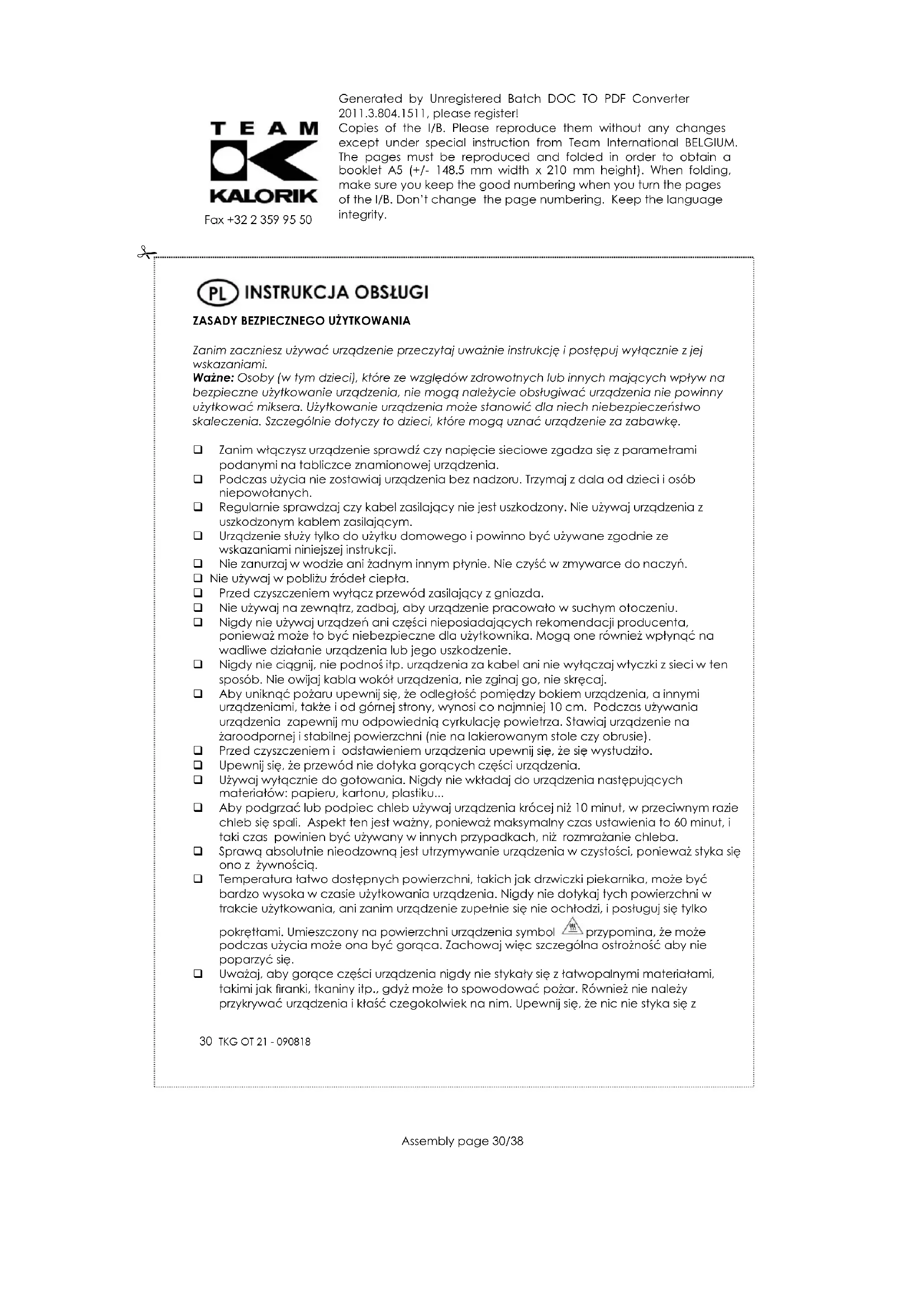 Zanim zaczniesz używać urządzenie przeczytaj uważnie instrukcję i postępuj wyłącznie z jej wskazaniami. Ważne: Osoby (w tym dzieci), które ze względów zdrowotnych lub innych mających wpływ na bezpieczne użytkowanie urządzenia, nie mogą należycie obsługiwać urządzenia nie powinny użytkować miksera. Użytkowanie urządzenia może stanowić dla niech niebezpieczeństwo skaleczenia. Szczególnie dotyczy to dzieci, które mogą uznać urządzenie za zabawkę. Zanim włączysz urządzenie sprawdź czy napięcie sieciowe zgadza się z parametrami podanymi na tabliczce znamionowej urządzenia. Podczas użycia nie zostawiaj urządzenia bez nadzoru. Trzymaj z dala od dzieci i osób niepowołanych. Regularnie sprawdzaj czy kabel zasilający nie jest uszkodzony. Nie używaj urządzenia z uszkodzonym kablem zasilającym. Urządzenie służy tylko do użytku domowego i powinno być używane zgodnie ze wskazaniami niniejszej instrukcji. Nie zanurzaj w wodzie ani żadnym innym płynie. Nie czyść w zmywarce do naczyń. Nie używaj w pobliżu źródeł ciepła. Przed czyszczeniem wyłącz przewód zasilający z gniazda. Nie używaj na zewnątrz, zadbaj, aby urządzenie pracowało w suchym otoczeniu. Nigdy nie używaj urządzeń ani części nieposiadających rekomendacji producenta, ponieważ może to być niebezpieczne dla użytkownika. Mogą one również wpłynąć na wadliwe działanie urządzenia lub jego uszkodzenie. Nigdy nie ciągnij, nie podnoś itp. urządzenia za kabel ani nie wyłączaj wtyczki z sieci w ten sposób. Nie owijaj kabla wokół urządzenia, nie zginaj go, nie skręcaj. Aby uniknąć pożaru upewnij się, że odległość pomiędzy bokiem urządzenia, a innymi urządzeniami, także i od górnej strony, wynosi co najmniej 10 cm. Podczas używania urządzenia zapewnij mu odpowiednią cyrkulację powietrza. Stawiaj urządzenie na żaroodpornej i stabilnej powierzchni (nie na lakierowanym stole czy obrusie). Przed czyszczeniem i odstawieniem urządzenia upewnij się, że się wystudziło. Upewnij się, że przewód nie dotyka gorących części urządzenia. Używaj wyłącznie do gotowania. Nigdy nie wkładaj do urządzenia następujących materiałów: papieru, kartonu, plastiku... Aby podgrzać lub podpiec chleb używaj urządzenia krócej niż 10 minut, w przeciwnym razie chleb się spali. Aspekt ten jest ważny, ponieważ maksymalny czas ustawienia to 60 minut, i taki czas powinien być używany w innych przypadkach, niż rozmrażanie chleba. Sprawą absolutnie nieodzowną jest utrzymywanie urządzenia w czystości, ponieważ styka się ono z żywnością. Temperatura łatwo dostępnych powierzchni, takich jak drzwiczki piekarnika, może być bardzo wysoka w czasie użytkowania urządzenia. Nigdy nie dotykaj tych powierzchni w trakcie użytkowania, ani zanim urządzenie zupełnie się nie ochłodzi, i posługuj się tylko pokrętłami. Umieszczony na powierzchni urządzenia symbol przypomina, że może podczas użycia może ona być gorąca. Zachowaj więc szczególna ostrożność aby nie poparzyć się. Uważaj, aby gorące części urządzenia nigdy nie stykały się z łatwopalnymi materiałami, takimi jak firanki, tkaniny itp., gdyż może to spowodować pożar. Również nie należy przykrywać urządzenia i kłaść czegokolwiek na nim. Upewnij się, że nic nie styka się zGenerated by Unregistered Batch DOC TO PDF Converter 2011.3.804.1511, please register! Copies of the I/B. Please reproduce them without any changes except under special instruction from Team International BELGIUM. The pages must be reproduced and folded in order to obtain a booklet A5 (+/- 148.5 mm width x 210 mm height). When folding, make sure you keep the good numbering when you turn the pages of the I/B. Don’t change the page numbering. Keep the language integrity.