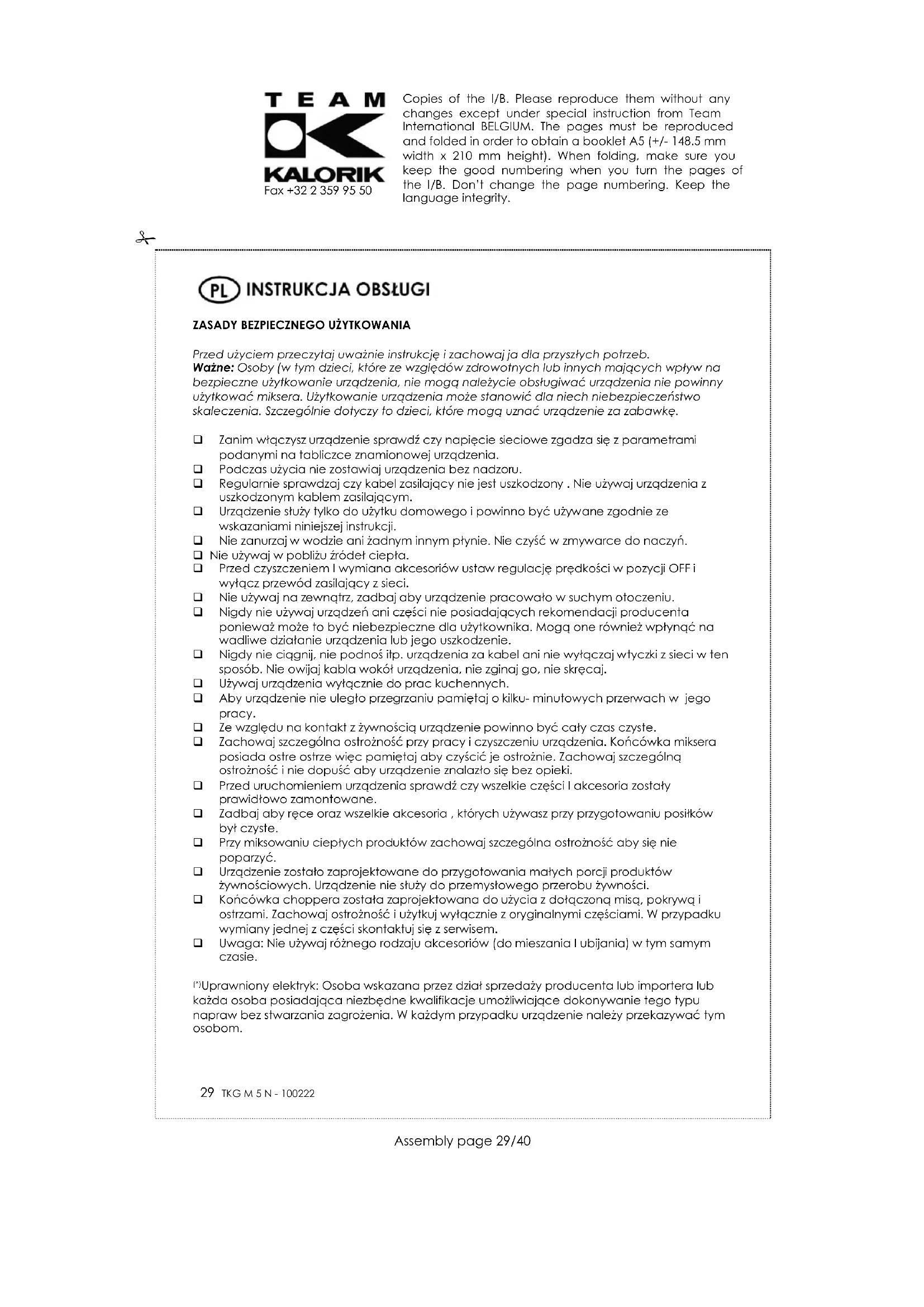 Uprawniony elektryk: Osoba wskazana przez dział sprzedaży producenta lub importera lub każda osoba posiadająca niezbędne kwalifikacje umożliwiające dokonywanie tego typu napraw bez stwarzania zagrożenia. W każdym przypadku urządzenie należy przekazywać tym osobom. Copies of the I/B. Please reproduce them without any changes except under special instruction from Team International BELGIUM. The pages must be reproduced and folded in order to obtain a booklet A5 (+/- 148.5 mm width x 210 mm height). When folding, make sure you keep the good numbering when you turn the pages of the I/B. Don’t change the page numbering. Keep the language integrity.
