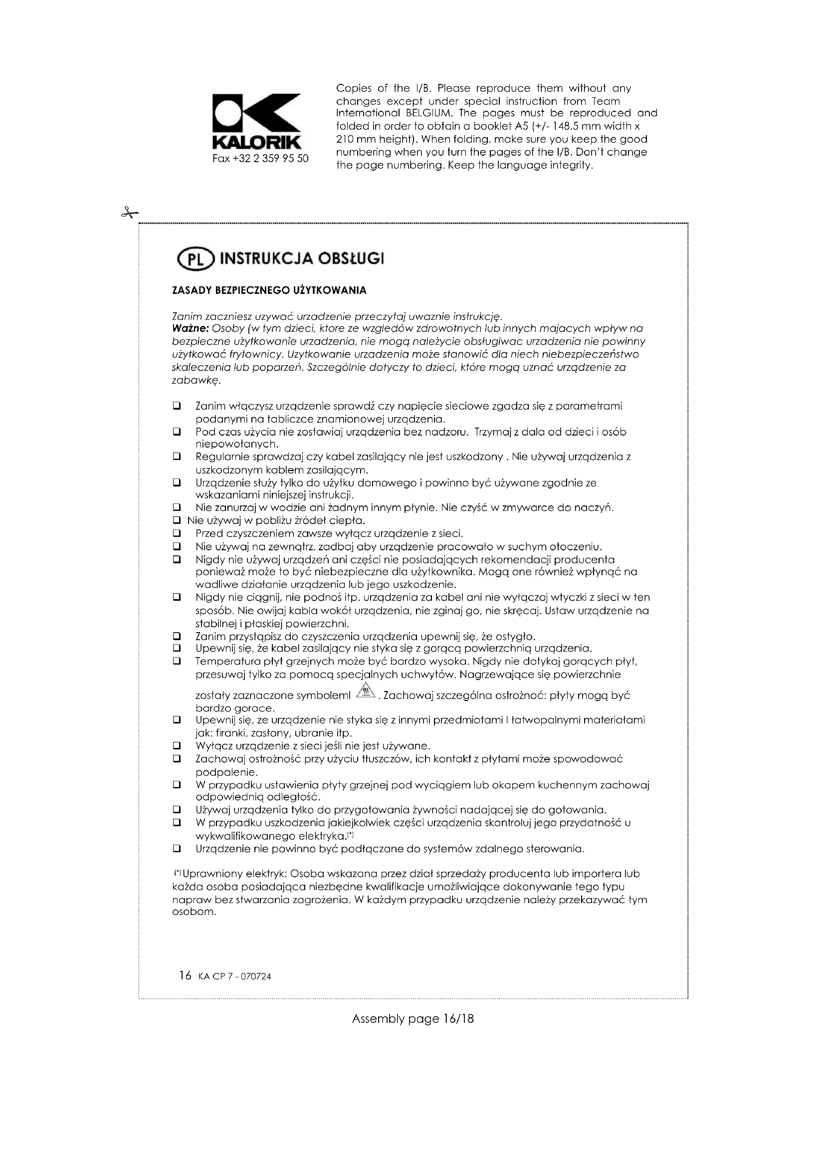 Uprawniony elektryk: Osoba wskazana przez dział sprzedaży producenta lub importera lub każda osoba posiadająca niezbędne kwalifikacje umożliwiające dokonywanie tego typu napraw bez stwarzania zagrożenia. W każdym przypadku urządzenie należy przekazywać tym osobom. Copies of the I/B. Please reproduce them without any changes except under special instruction from Team International BELGIUM. The pages must be reproduced and folded in order to obtain a booklet A5 (+/- 148.5 mm width x 210 mm height). When folding, make sure you keep the good numbering when you turn the pages of the I/B. Don‟t change the page numbering. Keep the language integrity. 17 KA CP 7 - 070724