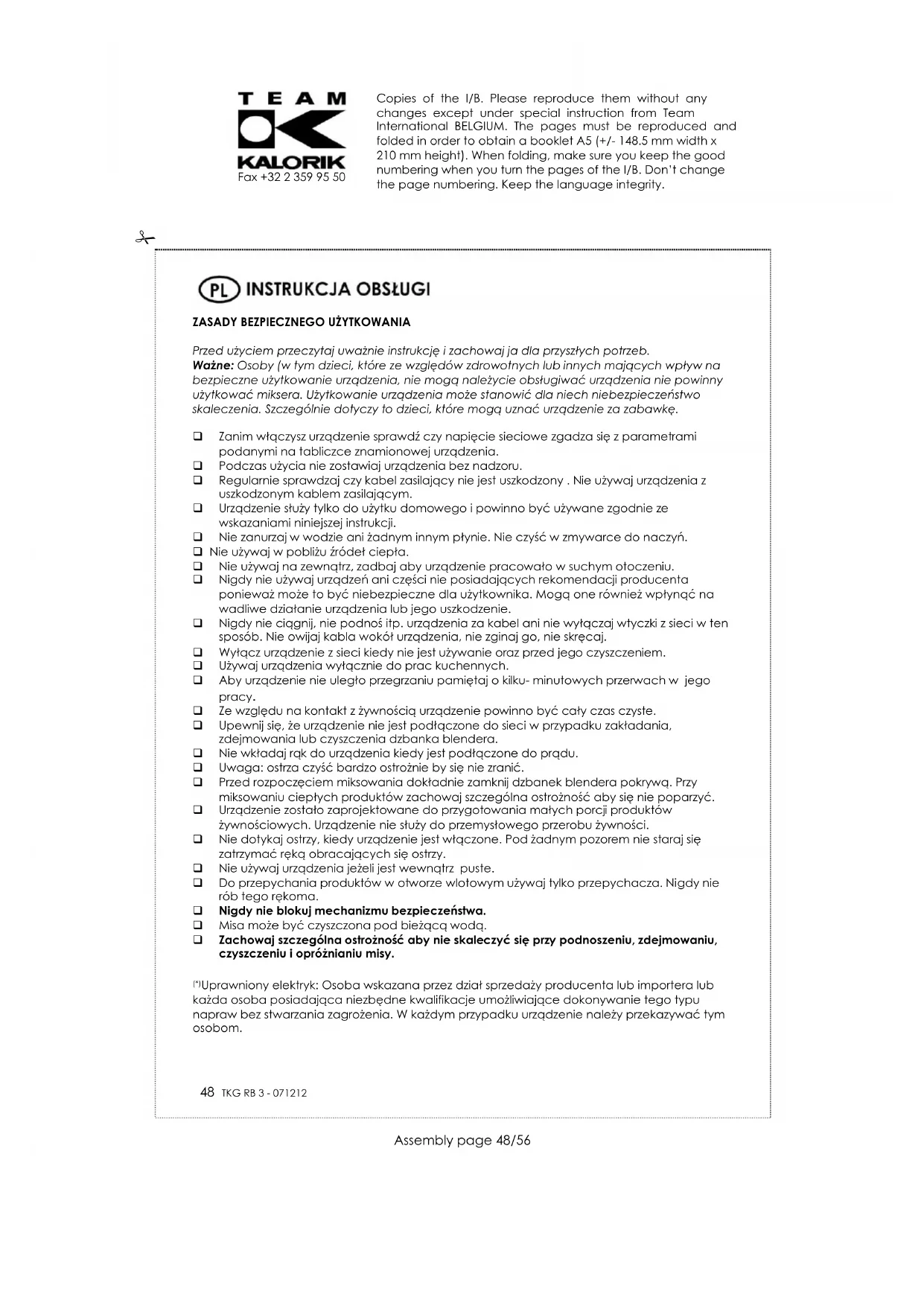 Uprawniony elektryk: Osoba wskazana przez dział sprzedaży producenta lub importera lub każda osoba posiadająca niezbędne kwalifikacje umożliwiające dokonywanie tego typu napraw bez stwarzania zagrożenia. W każdym przypadku urządzenie należy przekazywać tym osobom. Copies of the I/B. Please reproduce them without any changes except under special instruction from Team International BELGIUM. The pages must be reproduced and folded in order to obtain a booklet A5 (+/- 148.5 mm width x 210 mm height). When folding, make sure you keep the good numbering when you turn the pages of the I/B. Don’t change the page numbering. Keep the language integrity.