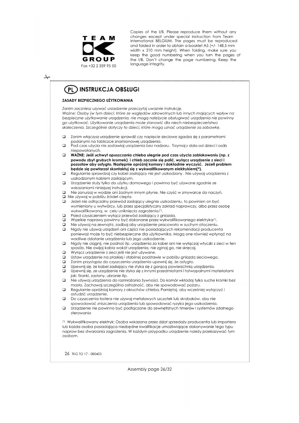 Zanim przystąpisz do czyszczenia upewnij się, ze urządzenie, jest wyłączone z sieci i w pełni ostudzone. Opróżnij tackę na okruchy znajdującą się z boku urządzenia. Uwaga! Regularnie opróżniaj tacke na okruchy. Zbyt duża ilość nagromadzonych okruchów może stanowić ryzyko podpalenia. Części zewnętrzne urządzenia przetrzyj miękką, wilgotną ściereczką lub gąbka. NIE ZANURZAJ W WODZIE. Wszelki inne czynności konserwacyjne I naprawy powinny być dokonane wyłącznie przez wykwalifikowany personel. W przypadku nie zastosowania się do powyższych instrukcji warunki gwarancji tracą ważność. Copies of the I/B. Please reproduce them without any changes except under special instruction from Team International BELGIUM. The pages must be reproduced and folded in order to obtain a booklet A5 (+/- 148.5 mm width x 210 mm height). When folding, make sure you keep the good numbering when you turn the pages of the I/B. Don’t change the page numbering. Keep the language integrity.