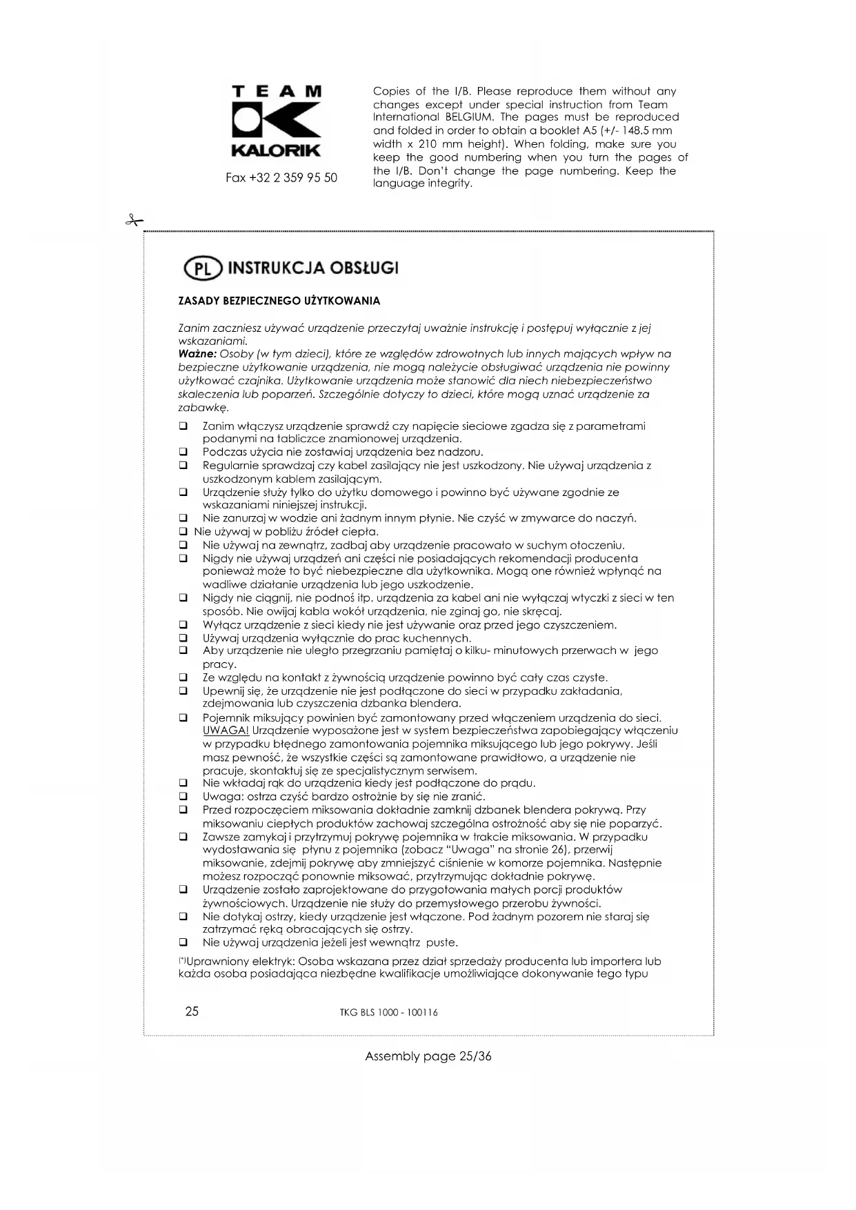 Przed czyszczeniem koniecznie wyłącz urządzenie z sieci. Aby szybko spłukać wnętrze dzbanka (np. pomiędzy miksowaniem dwóch różnych produktów) wlej trochę czystej wody do wnętrza I włącz urządzenia na kilka sekund. Nie używaj żadnych detergentów. Copies of the I/B. Please reproduce them without any changes except under special instruction from Team International BELGIUM. The pages must be reproduced and folded in order to obtain a booklet A5 (+/- 148.5 mm width x 210 mm height). When folding, make sure you keep the good numbering when you turn the pages of the I/B. Don’t change the page numbering. Keep the language integrity.