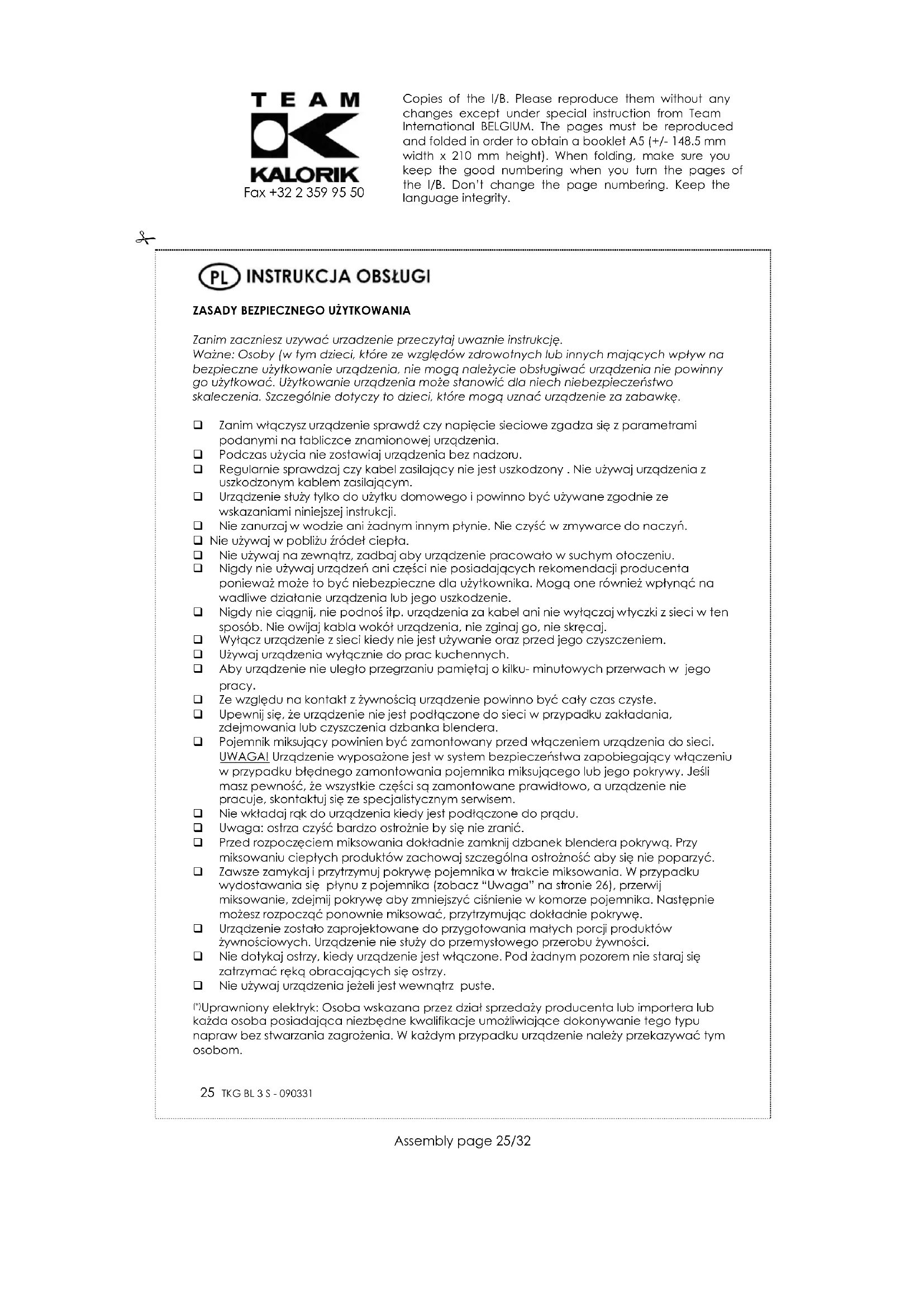 Przed czyszczeniem koniecznie wyłącz urządzenie z sieci. Aby szybko spłukać wnętrze dzbanka (np. pomiędzy miksowaniem dwóch różnych produktów) wlej trochę czystej wody do wnętrza I włącz urządzenia na kilka sekund. Nie używaj żadnych detergentów. Aby w pełni wyczyścić urządzenie, zdejmij dzbanek blendera z podstawy urządzenia. Następnie rozmontuj ostrza odkręcając pierścień mocujący w stronę przeciwną do ruch wskazówek zegara. Rozmontowane części blendera (oprócz obudowy silnika) wyczyść pod bieżącą wodą z użyciem płynu do mycia naczyń. Dokładnie wysusz przed ponownym montażem. Aby ponownie założyć ostrza, umieść je w pierścieniu, a następnie całość załóż na spodzie dzbanka I przekręć zgodnie z ruchem wskazówek zegara. Żadnej części urządzenia nie czyść w zmywarce do naczyń. Obudowę silnika przetrzyj miękką ściereczką. Copies of the I/B. Please reproduce them without any changes except under special instruction from Team International BELGIUM. The pages must be reproduced and folded in order to obtain a booklet A5 (+/- 148.5 mm width x 210 mm height). When folding, make sure you keep the good numbering when you turn the pages of the I/B. Don’t change the page numbering. Keep the language integrity.