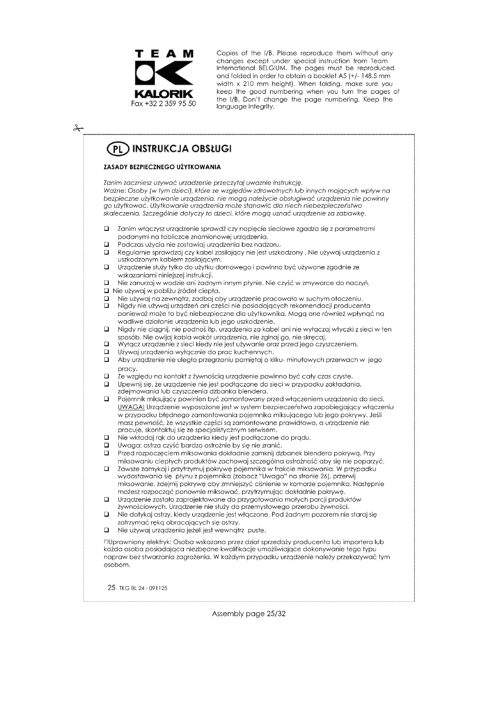 Przed czyszczeniem koniecznie wyłącz urządzenie z sieci. Aby szybko spłukać wnętrze dzbanka (np. pomiędzy miksowaniem dwóch różnych produktów) wlej trochę czystej wody do wnętrza I włącz urządzenia na kilka sekund. Nie używaj żadnych detergentów. Żadnej części urządzenia nie czyść w zmywarce do naczyń. Obudowę silnika przetrzyj miękką ściereczką. Copies of the I/B. Please reproduce them without any changes except under special instruction from Team International BELGIUM. The pages must be reproduced and folded in order to obtain a booklet A5 (+/- 148.5 mm width x 210 mm height). When folding, make sure you keep the good numbering when you turn the pages of the I/B. Don’t change the page numbering. Keep the language integrity.