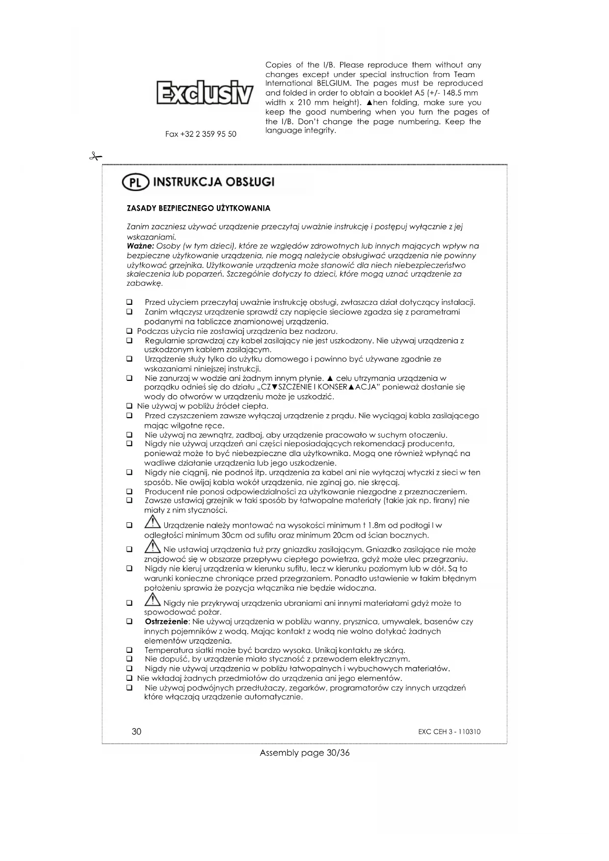 Fax +32 2 359 95 50 Nie uŜywaj urządzenia w miejscu gdzie powietrze zawiera zbyt duŜo chloru, dwutlenku siarki lub palnych gazów. Te składniki powodują ciemnienie bądź odbarwienie elementów grzewczych oraz pogorszenie pracy urządzenia.