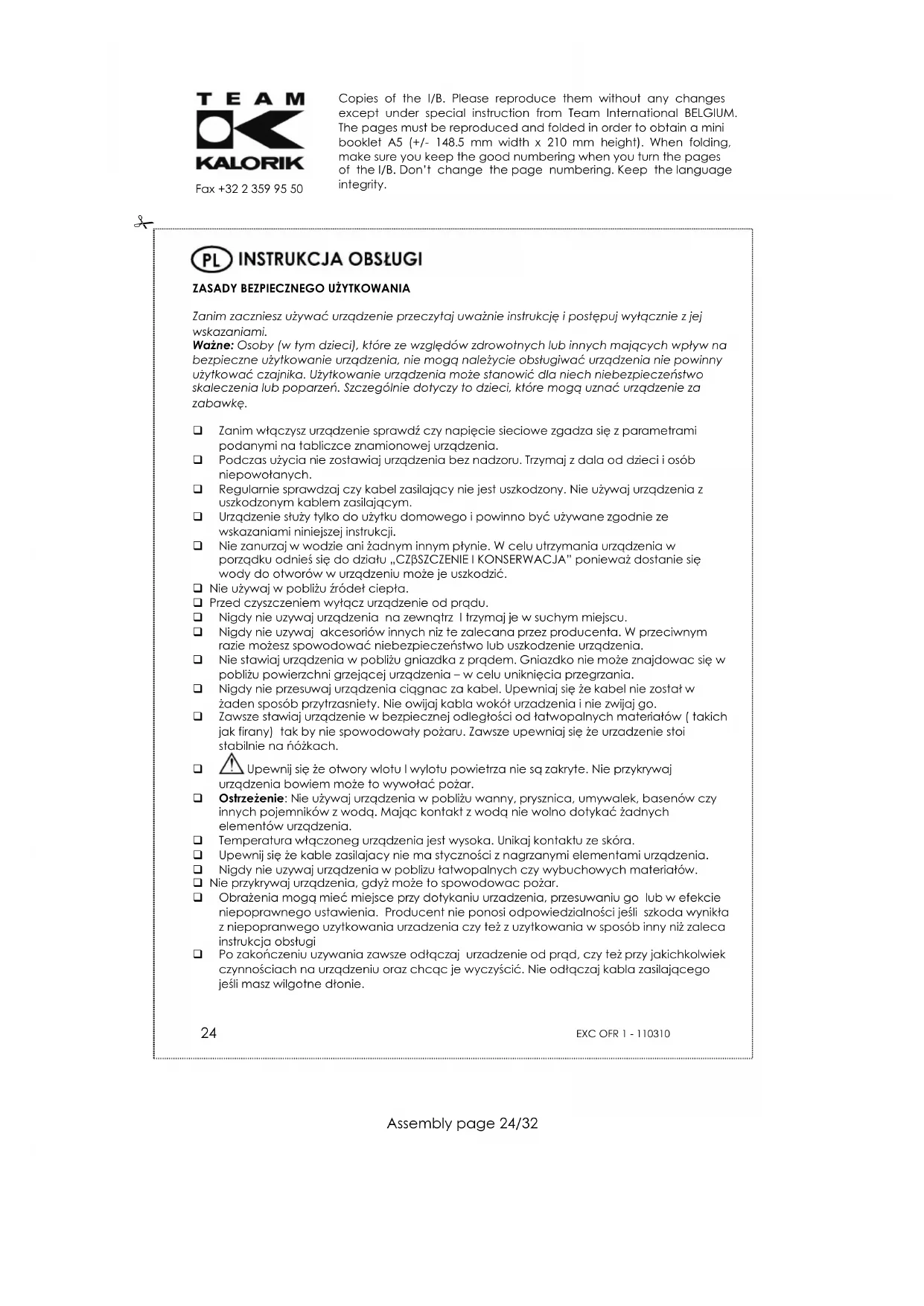 ZASADY BEZPIECZNEGO UśYTKOWANIA Zanim zaczniesz uŜywać urządzenie przeczytaj uwaŜnie instrukcję i postępuj wyłącznie z jej wskazaniami. WaŜne: Osoby (w tym dzieci), które ze względów zdrowotnych lub innych mających wpływ na bezpieczne uŜytkowanie urządzenia, nie mogą naleŜycie obsługiwać urządzenia nie powinny uŜytkować czajnika. UŜytkowanie urządzenia moŜe stanowić dla niech niebezpieczeństwo skaleczenia lub poparzeń. Szczególnie dotyczy to dzieci, które mogą uznać urządzenie za zabawkę. Zanim włączysz urządzenie sprawdź czy napięcie sieciowe zgadza się z parametrami podanymi na tabliczce znamionowej urządzenia. Podczas uŜycia nie zostawiaj urządzenia bez nadzoru. Trzymaj z dala od dzieci i osób niepowołanych. Regularnie sprawdzaj czy kabel zasilający nie jest uszkodzony. Nie uŜywaj urządzenia z uszkodzonym kablem zasilającym. Urządzenie słuŜy tylko do uŜytku domowego i powinno być uŜywane zgodnie ze wskazaniami niniejszej instrukcji. Nie zanurzaj w wodzie ani Ŝadnym innym płynie. W celu utrzymania urządzenia w porządku odnieś się do działu „CZYSZCZENIE I KONSERWACJA” poniewaŜ dostanie się wody do otworów w urządzeniu moŜe je uszkodzić. Nie uŜywaj w pobliŜu źródeł ciepła. Przed czyszczeniem wyłącz urządzenie od prądu. Nigdy nie uzywaj urządzenia na zewnątrz I trzymaj je w suchym miejscu. Nigdy nie uzywaj akcesoriów innych niz te zalecana przez producenta. W przeciwnym razie moŜesz spowodować niebezpieczeństwo lub uszkodzenie urządzenia. Nie stawiaj urządzenia w pobliŜu gniazdka z prądem. Gniazdko nie moŜe znajdowac się w pobliŜu powierzchni grzejącej urządzenia – w celu uniknięcia przegrzania. Nigdy nie przesuwaj urządzenia ciągnac za kabel. Upewniaj się Ŝe kabel nie został w Ŝaden sposób przytrzasniety. Nie owijaj kabla wokół urzadzenia i nie zwijaj go. Zawsze stawiaj urządzenie w bezpiecznej odległości od łatwopalnych materiałów ( takich jak firany) tak by nie spowodowały poŜaru. Zawsze upewniaj się Ŝe urzadzenie stoi stabilnie na ńóŜkach. Upewnij się Ŝe otwory wlotu I wylotu powietrza nie są zakryte. Nie przykrywaj urządzenia bowiem moŜe to wywołać poŜar. OstrzeŜenie: Nie uŜywaj urządzenia w pobliŜu wanny, prysznica, umywalek, basenów czy innych pojemników z wodą. Mając kontakt z wodą nie wolno dotykać Ŝadnych elementów urządzenia. Temperatura włączoneg urządzenia jest wysoka. Unikaj kontaktu ze skóra. Upewnij się Ŝe kable zasilajacy nie ma styczności z nagrzanymi elementami urządzenia. Nigdy nie uzywaj urządzenia w poblizu łatwopalnych czy wybuchowych materiałów. Nie przykrywaj urządzenia, gdyŜ moŜe to spowodowac poŜar. ObraŜenia mogą mieć miejsce przy dotykaniu urzadzenia, przesuwaniu go lub w efekcie niepoprawnego ustawienia. Producent nie ponosi odpowiedzialności jeśli szkoda wynikła z niepopranwego uzytkowania urzadzenia czy teŜ z uzytkowania w sposób inny niŜ zaleca instrukcja obsługi Po zakończeniu uzywania zawsze odłączaj urzadzenie od prąd, czy teŜ przy jakichkolwiek czynnościach na urządzeniu oraz chcąc je wyczyścić. Nie odłączaj kabla zasilającego jeśli masz wilgotne dłonie.Copies of the I/B. Please reproduce them without any changes except under special instruction from Team International BELGIUM. The pages must be reproduced and folded in order to obtain a mini booklet A5 (+/- 148.5 mm width x 210 mm height). When folding, make sure you keep the good numbering when you turn the pages of the I/B. Don’t change the page numbering. Keep the language integrity.