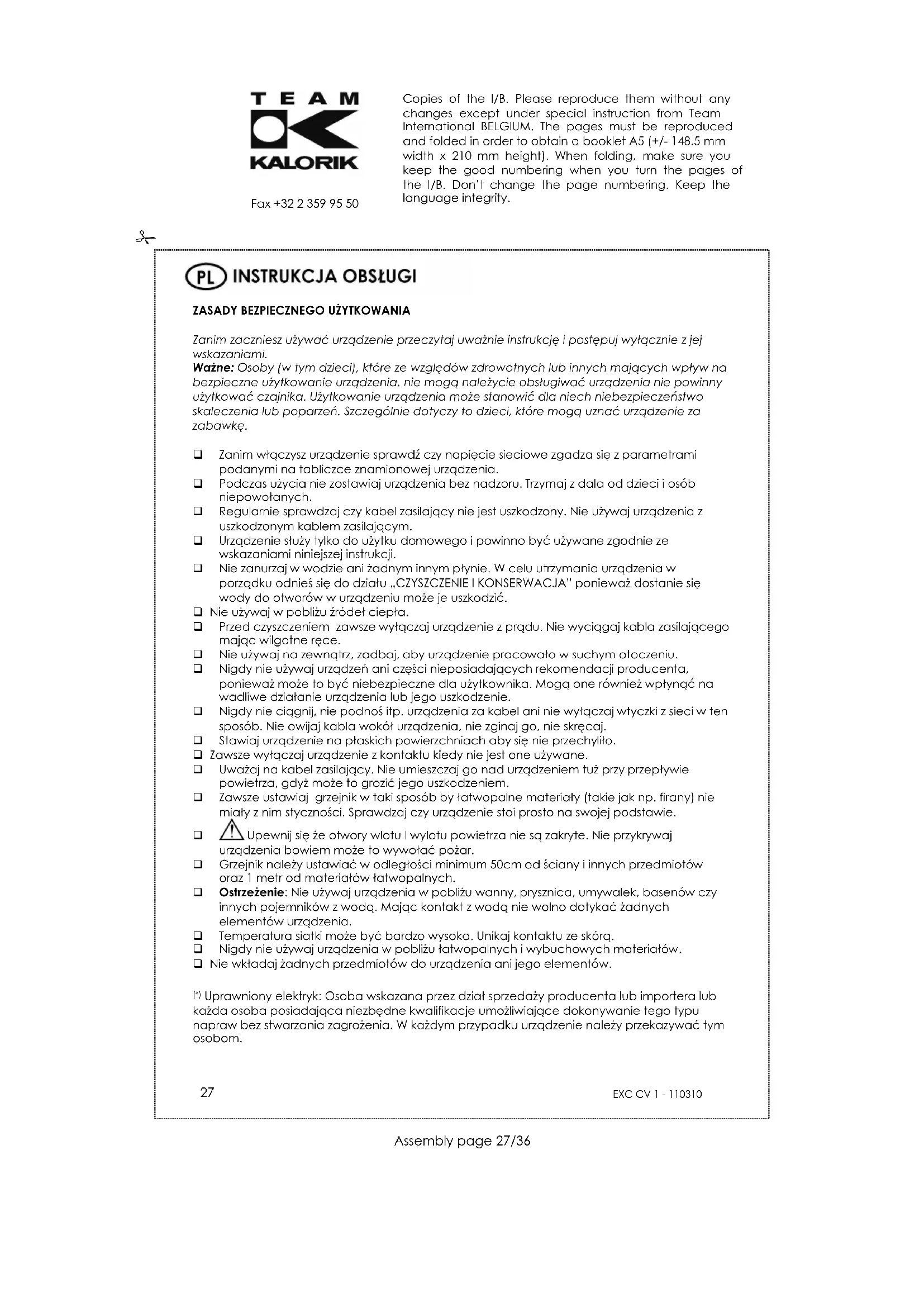 EXC CV 1 - Ogrzewanie KALORIK - Bezpłatna instrukcja obsługi