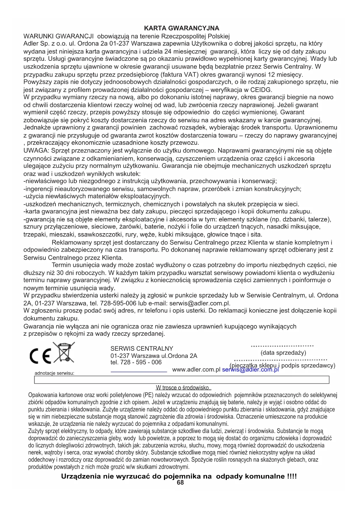 Përpara pastrimit, shkëputeni fryerjen e thellë nga furnizimi me energji elektrike dhe sigurohuni që vaji dhe pajisja të jenë ftohur. Lani sipërfaqen e jashtme të fryerës së thellë duke përdorur një leckë të pastër të lagur. Ena e vajit mund të hiqet, por nuk duhet pastruar në makinë larëse enësh. Asnjëherë mos përdorni leckë të trashë ose alkool për pastrimin e pajisjes. Hiqeni dorezën nga koshi dhe pastrojeni duke përdorur ujë me lëng për larjen e enëve. KUJDES: KURRË mos e lani pajisjen nën ujë të rrjedhshëm TË DHËNAT TEKNIKE: Tensioni: 220-240V ~50/60Hz Fuqia: 1800 W Kapaciteti : 2,5L Për të mbrojtur mjedisin: ndani kartonat dhe qeset plastike dhe vendosini në kontejnerët e duhur të mbeturinave. Pajisja e përdorur duhet të dorëzohet në pika të veçanta grumbullimi që mund të ndikojnë në mjedis. Mos e hidhni këtë pajisje në mbeturina normale.68 KARTA GWARANCYJNA WARUNKI GWARANCJI obowiązują na terenie Rzeczpospolitej Polskiej Adler Sp. z o.o. ul. Ordona 2a 01-237 Warszawa zapewnia Użytkownika o dobrej jakości sprzętu, na który wydana jest niniejsza karta gwarancyjna i udziela 24 miesięcznej gwarancji, która liczy się od daty zakupu sprzętu. Usługi gwarancyjne świadczone są po okazaniu prawidłowo wypełnionej karty gwarancyjnej. Wady lub uszkodzenia sprzętu ujawnione w okresie gwarancji usuwane będą bezpłatnie przez Serwis Centralny. W przypadku zakupu sprzętu przez przedsiębiorcę (faktura VAT) okres gwarancji wynosi 12 miesięcy. Powyższy zapis nie dotyczy jednoosobowych działalności gospodarczych, o ile rodzaj zakupionego sprzętu, nie jest związany z profilem prowadzonej działalności gospodarczej – weryfikacja w CEIDG. W przypadku wymiany rzeczy na nową, albo po dokonaniu istotnej naprawy, okres gwarancji biegnie na nowo od chwili dostarczenia klientowi rzeczy wolnej od wad, lub zwrócenia rzeczy naprawionej. Jeżeli gwarant wymienił część rzeczy, przepis powyższy stosuje się odpowiednio do części wymienionej. Gwarant zobowiązuje się pokryć koszty dostarczenia rzeczy do serwisu na adres wskazany w karcie gwarancyjnej. Jednakże uprawniony z gwarancji powinien zachować rozsądek, wybierając środek transportu. Uprawnionemu z gwarancji nie przysługuje od gwaranta zwrot kosztów dostarczenia towaru – rzeczy do naprawy gwarancyjnej , przekraczający ekonomicznie uzasadnione koszty przewozu. UWAGA: Sprzęt przeznaczony jest wyłącznie do użytku domowego. Naprawami gwarancyjnymi nie są objęte czynności związane z odkamienianiem, konserwacją, czyszczeniem urządzenia oraz części i akcesoria ulegające zużyciu przy normalnym użytkowaniu. Gwarancja nie obejmuje mechanicznych uszkodzeń sprzętu oraz wad i uszkodzeń wynikłych wskutek: -niewłaściwego lub niezgodnego z instrukcją użytkowania, przechowywania i konserwacji; -ingerencji nieautoryzowanego serwisu, samowolnych napraw, przeróbek i zmian konstrukcyjnych; -użycia niewłaściwych materiałów eksploatacyjnych. -uszkodzeń mechanicznych, termicznych, chemicznych i powstałych na skutek przepięcia w sieci. -karta gwarancyjna jest nieważna bez daty zakupu, pieczęci sprzedającego i kopii dokumentu zakupu. -gwarancją nie są objęte elementy eksploatacyjne i akcesoria w tym: elementy szklane (np. dzbanki, talerze), sznury przyłączeniowe, sieciowe, żarówki, baterie, nożyki i folie do urządzeń tnących, nasadki miksujące, trzepaki, mieszaki, ssawkoszczotki, rury, węże, kubki miksujące, głowice tnące i sita. Reklamowany sprzęt jest dostarczany do Serwisu Centralnego przez Klienta w stanie kompletnym i odpowiednio zabezpieczony na czas transportu. Po dokonanej naprawie reklamowany sprzęt odbierany jest z Serwisu Centralnego przez Klienta. Termin usunięcia wady może zostać wydłużony o czas potrzebny do importu niezbędnych części, nie dłuższy niż 30 dni roboczych. W każdym takim przypadku warsztat serwisowy powiadomi klienta o wydłużeniu terminu naprawy gwarancyjnej. W związku z koniecznością sprowadzenia części zamiennych i poinformuje o nowym terminie usunięcia wady. W przypadku stwierdzenia usterki należy ją zgłosić w punkcie sprzedaży lub w Serwisie Centralnym, ul. Ordona 2A, 01-237 Warszawa, tel. 728-595-006 lub e-mail: serwis@adler.com.pl. W zgłoszeniu proszę podać swój adres, nr telefonu i opis usterki. Do reklamacji konieczne jest dołączenie kopii dokumentu zakupu. Gwarancja nie wyłącza ani nie ogranicza oraz nie zawiesza uprawnień kupującego wynikających z przepisów o rękojmi za wady rzeczy sprzedanej. SERWIS CENTRALNY 01-237 Warszawa ul.Ordona 2A tel. 728 - 595 - 006 www.adler.com.pl serwis@adler.com.pl (data sprzedaży) (pieczątka sklepu i podpis sprzedawcy) adnotacje serwisu: Urządzenia nie wyrzucać do pojemnika na odpady komunalne !!!! W trosce o środowisko.. Opakowania kartonowe oraz worki polietylenowe (PE) należy wrzucać do odpowiednich pojemników przeznaczonych do selektywnej zbiórki odpadów komunalnych zgodnie z ich opisem. Jeżeli w urządzeniu znajdują się baterie, należy je wyjąć i osobno oddać do punktu zbierania i składowania. Zużyte urządzenie należy oddać do odpowiedniego punktu zbierania i składowania, gdyż znajdujące się w nim niebezpieczne substancje mogą stanowić zagrożenie dla zdrowia i środowiska. Oznaczenie umieszczone na produkcie wskazuje, że urządzenia nie należy wyrzucać do pojemnika z odpadami komunalnymi. Zużyty sprzęt elektryczny, to odpady, które zawierają substancje szkodliwe dla ludzi, zwierząt i środowiska. Substancje te mogą doprowadzić do zanieczyszczenia gleby, wody lub powietrze, a poprzez to mogą się dostać do organizmu człowieka i doprowadzić do licznych dolegliwości zdrowotnych, takich jak: zaburzenia wzroku, słuchu, mowy, mogą również doprowadzić do uszkodzenia nerek, wątroby i serca, oraz wywołać choroby skóry. Substancje szkodliwe mogą mieć również niekorzyst