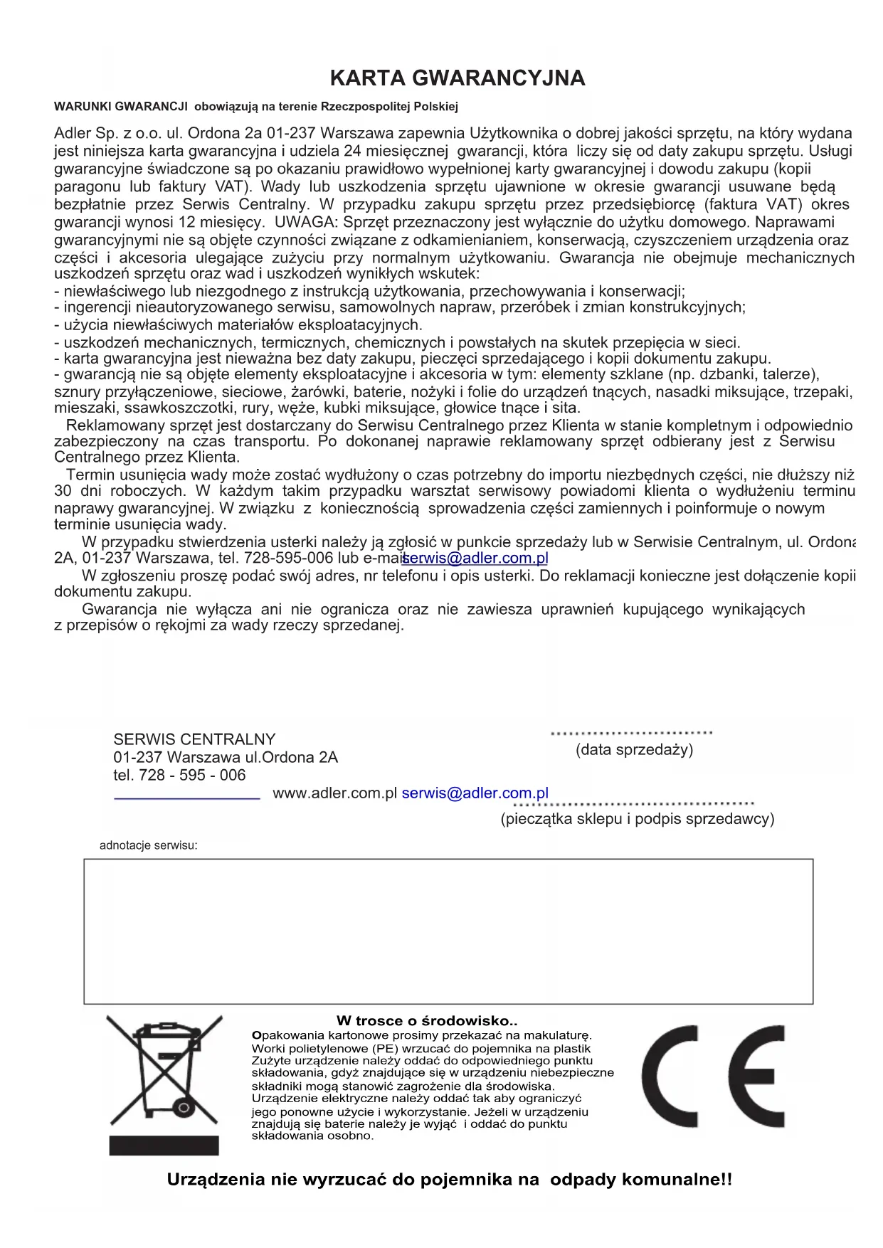 W trosce o środowisko..Opakowania kartonowe prosimy przekazać na makulaturę.Worki polietylenowe (PE) wrzucać do pojemnika na plastikZużyte urządzenie należy oddać do odpowiedniego punktu składowania, gdyż znajdujące się w urządzeniu niebezpieczne składniki mogą stanowić zagrożenie dla środowiska. Urządzenie elektryczne należy oddać tak aby ograniczyćjego ponowne użycie i wykorzystanie. Jeżeli w urządzeniuznajdują się baterie należy je wyjąć i oddać do punktu składowania osobno. KARTA GWARANCYJNA WARUNKI GWARANCJI obowiązują na terenie Rzeczpospolitej PolskiejAdler Sp. z o.o. ul. Ordona 2a 01-237 Warszawa zapewnia Użytkownika o dobrej jakości sprzętu, na który wydana jest niniejsza karta gwarancyjna i udziela 24 miesięcznej gwarancji, która liczy się od daty zakupu sprzętu. Usługi gwarancyjne świadczone są po okazaniu prawidłowo wypełnionej karty gwarancyjnej i dowodu zakupu (kopii paragonu lub faktury VAT). Wady lub uszkodzenia sprzętu ujawnione w okresie gwarancji usuwane będą bezpłatnie przez Serwis Centralny. W przypadku zakupu sprzętu przez przedsiębiorcę (faktura VAT) okres gwarancji wynosi 12 miesięcy. UWAGA: Sprzęt przeznaczony jest wyłącznie do użytku domowego. Naprawami gwarancyjnymi nie są objęte czynności związane z odkamienianiem, konserwacją, czyszczeniem urządzenia oraz części i akcesoria ulegające zużyciu przy normalnym użytkowaniu. Gwarancja nie obejmuje mechanicznych uszkodzeń sprzętu oraz wad i uszkodzeń wynikłych wskutek:- niewłaściwego lub niezgodnego z instrukcją użytkowania, przechowywania i konserwacji;- ingerencji nieautoryzowanego serwisu, samowolnych napraw, przeróbek i zmian konstrukcyjnych;- użycia niewłaściwych materiałów eksploatacyjnych. - uszkodzeń mechanicznych, termicznych, chemicznych i powstałych na skutek przepięcia w sieci.- karta gwarancyjna jest nieważna bez daty zakupu, pieczęci sprzedającego i kopii dokumentu zakupu.- gwarancją nie są objęte elementy eksploatacyjne i akcesoria w tym: elementy szklane (np. dzbanki, talerze), sznury przyłączeniowe, sieciowe, żarówki, baterie, nożyki i folie do urządzeń tnących, nasadki miksujące, trzepaki, mieszaki, ssawkoszczotki, rury, węże, kubki miksujące, głowice tnące i sita.Reklamowany sprzęt jest dostarczany do Serwisu Centralnego przez Klienta w stanie kompletnym i odpowiednio zabezpieczony na czas transportu. Po dokonanej naprawie reklamowany sprzęt odbierany jest z Serwisu Centralnego przez Klienta.Termin usunięcia wady może zostać wydłużony o czas potrzebny do importu niezbędnych części, nie dłuższy niż 30 dni roboczych. W każdym takim przypadku warsztat serwisowy powiadomi klienta o wydłużeniu terminu naprawy gwarancyjnej. W związku z koniecznością sprowadzenia części zamiennych i poinformuje o nowym terminie usunięcia wady.W przypadku stwierdzenia usterki należy ją zgłosić w punkcie sprzedaży lub w Serwisie Centralnym, ul. Ordona 2A, 01-237 Warszawa, tel. 728-595-006 lub e-mail: . W zgłoszeniu proszę podać swój adres, nr telefonu i opis usterki. Do reklamacji konieczne jest dołączenie kopii dokumentu zakupu.Gwarancja nie wyłącza ani nie ogranicza oraz nie zawiesza uprawnień kupującego wynikających z przepisów o rękojmi za wady rzeczy sprzedanej.serwis@adler.com.plSERWIS CENTRALNY01-237 Warszawa ul.Ordona 2Atel. 728 - 595 - 006 www.adler.com.pl serwis@adler.com.pl(data sprzedaży)(pieczątka sklepu i podpis sprzedawcy)adnotacje serwisu:POLSKI