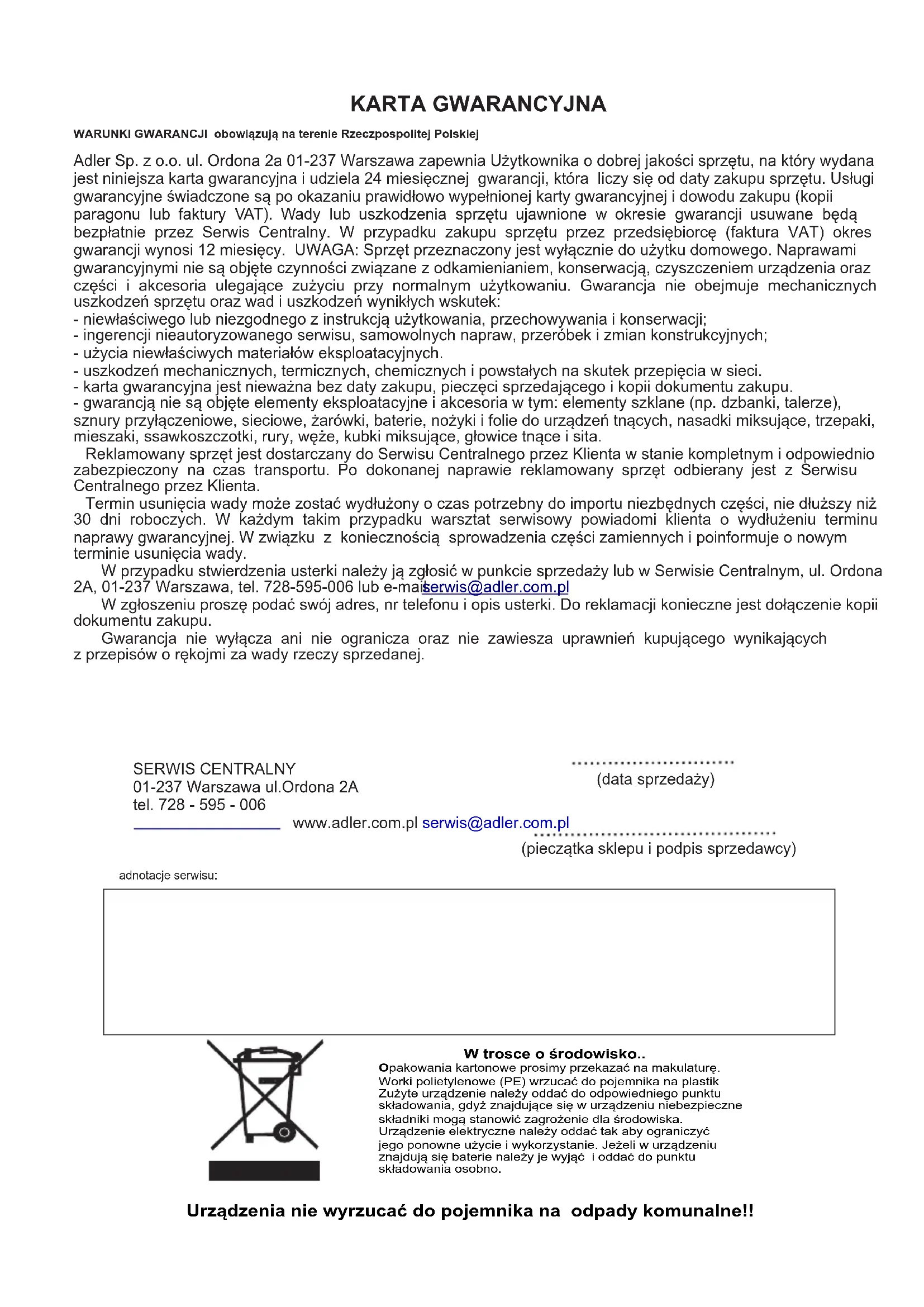W trosce o środowisko.. Opakowania kartonowe prosimy przekazać na makulaturę.Worki polietylenowe (PE) wrzucać do pojemnika na plastikZużyte urządzenie należy oddać do odpowiedniego punktu składowania, gdyż znajdujące się w urządzeniu niebezpieczne składniki mogą stanowić zagrożenie dla środowiska. Urządzenie elektryczne należy oddać tak aby ograniczyćjego ponowne użycie i wykorzystanie. Jeżeli w urządzeniuznajdują się baterie należy je wyjąć i oddać do punktu składowania osobno. KARTA GWARANCYJNA WARUNKI GWARANCJI obowiązują na terenie Rzeczpospolitej Polskiej Adler Sp. z o.o. ul. Ordona 2a 01-237 Warszawa zapewnia Użytkownika o dobrej jakości sprzętu, na który wydana jest niniejsza karta gwarancyjna i udziela 24 miesięcznej gwarancji, która liczy się od daty zakupu sprzętu. Usługi gwarancyjne świadczone są po okazaniu prawidłowo wypełnionej karty gwarancyjnej i dowodu zakupu (kopii paragonu lub faktury VAT). Wady lub uszkodzenia sprzętu ujawnione w okresie gwarancji usuwane będą bezpłatnie przez Serwis Centralny. W przypadku zakupu sprzętu przez przedsiębiorcę (faktura VAT) okres gwarancji wynosi 12 miesięcy. UWAGA: Sprzęt przeznaczony jest wyłącznie do użytku domowego. Naprawami gwarancyjnymi nie są objęte czynności związane z odkamienianiem, konserwacją, czyszczeniem urządzenia oraz części i akcesoria ulegające zużyciu przy normalnym użytkowaniu. Gwarancja nie obejmuje mechanicznych uszkodzeń sprzętu oraz wad i uszkodzeń wynikłych wskutek: - niewłaściwego lub niezgodnego z instrukcją użytkowania, przechowywania i konserwacji; - ingerencji nieautoryzowanego serwisu, samowolnych napraw, przeróbek i zmian konstrukcyjnych; - użycia niewłaściwych materiałów eksploatacyjnych. - uszkodzeń mechanicznych, termicznych, chemicznych i powstałych na skutek przepięcia w sieci. - karta gwarancyjna jest nieważna bez daty zakupu, pieczęci sprzedającego i kopii dokumentu zakupu. - gwarancją nie są objęte elementy eksploatacyjne i akcesoria w tym: elementy szklane (np. dzbanki, talerze), sznury przyłączeniowe, sieciowe, żarówki, baterie, nożyki i folie do urządzeń tnących, nasadki miksujące, trzepaki, mieszaki, ssawkoszczotki, rury, węże, kubki miksujące, głowice tnące i sita. Reklamowany sprzęt jest dostarczany do Serwisu Centralnego przez Klienta w stanie kompletnym i odpowiednio zabezpieczony na czas transportu. Po dokonanej naprawie reklamowany sprzęt odbierany jest z Serwisu Centralnego przez Klienta. Termin usunięcia wady może zostać wydłużony o czas potrzebny do importu niezbędnych części, nie dłuższy niż 30 dni roboczych. W każdym takim przypadku warsztat serwisowy powiadomi klienta o wydłużeniu terminu naprawy gwarancyjnej. W związku z koniecznością sprowadzenia części zamiennych i poinformuje o nowym terminie usunięcia wady. W przypadku stwierdzenia usterki należy ją zgłosić w punkcie sprzedaży lub w Serwisie Centralnym, ul. Ordona 2A, 01-237 Warszawa, tel. 728-595-006 lub e-mail: . W zgłoszeniu proszę podać swój adres, nr telefonu i opis usterki. Do reklamacji konieczne jest dołączenie kopii dokumentu zakupu. Gwarancja nie wyłącza ani nie ogranicza oraz nie zawiesza uprawnień kupującego wynikających z przepisów o rękojmi za wady rzeczy sprzedanej. serwis@adler.com.pl SERWIS CENTRALNY 01-237 Warszawa ul.Ordona 2A tel. 728 - 595 - 006 www.adler.com.pl serwis@adler.com.pl (data sprzedaży) (pieczątka sklepu i podpis sprzedawcy) adnotacje serwisu:OGÓLNE WARUNKI BEZPIECZEŃSTWA WAŻNE INSTRUKCJE DOTYCZĄCE BEZPIECZEŃSTWA UŻYTKOWANIA PRZECZYTAJ UWAŻNIE I ZACHOWAJ NA PRZYSZŁOŚĆ POLSKI