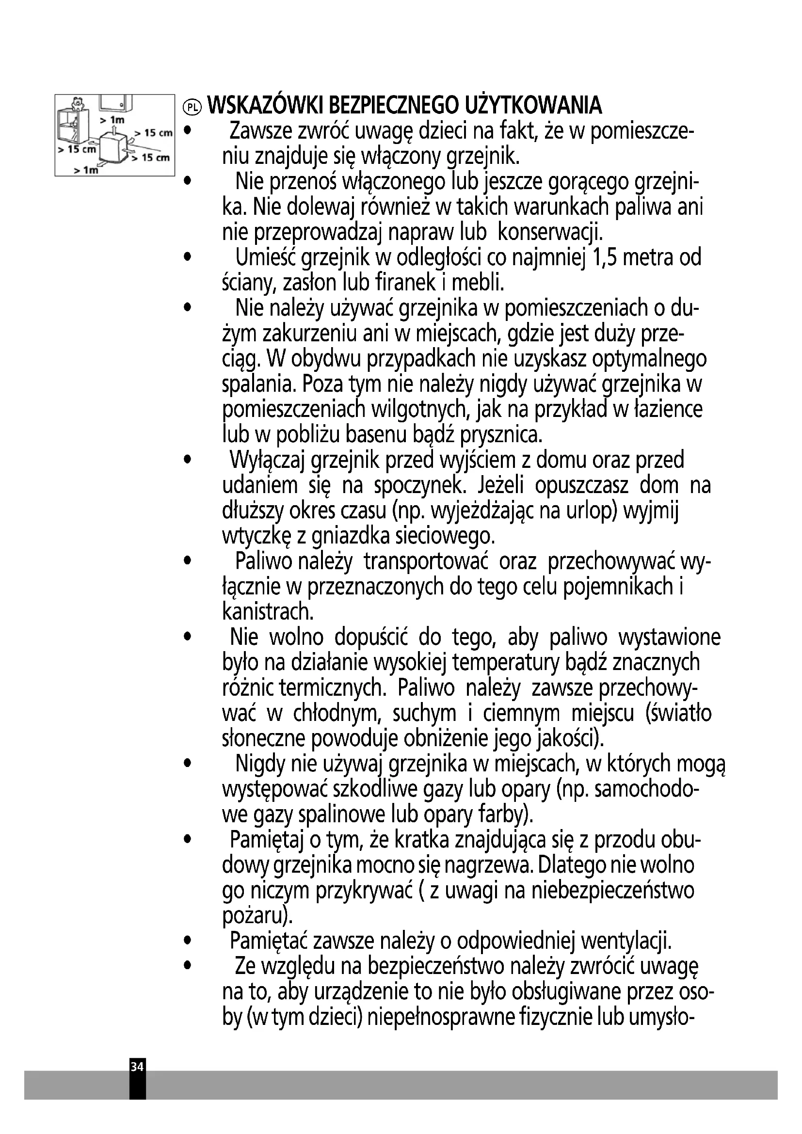 - Nie należy używać grzejnika w pomieszczeniach o du- żym zakurzeniu ani w miejscach, gdzie jest duży prze- ciąg. W obydwu przypadkach nie uzyskasz optymalnego spalania. Poza tym nie należy nigdy używać grzejnika w pomieszczeniach wilgotnych, jak na przykład w łazience lub w pobliżu basenu bądź prysznica.
